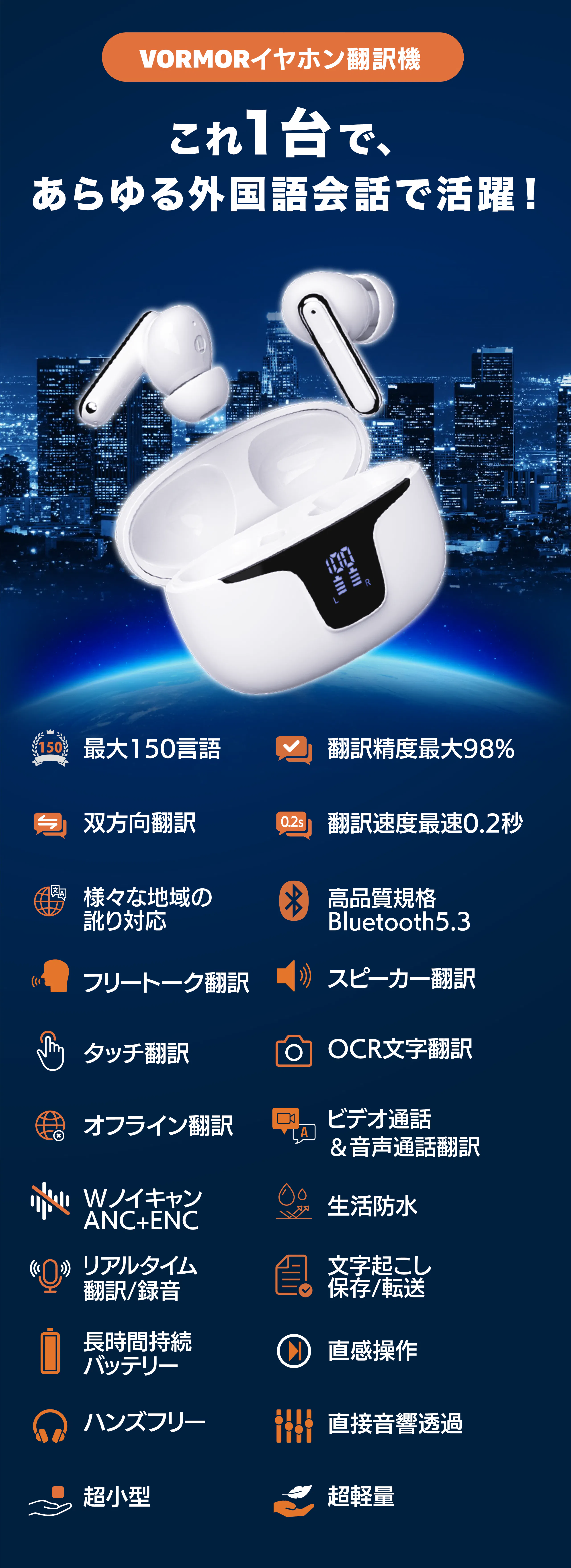 VORMOR Smart Translation Earphones V49(以下、V49)は、言語の異なる外国人とのコミュニケーションで150言語を瞬時に相互翻訳しながら、周りの騒音をカットするAIイヤホン型翻訳機です。