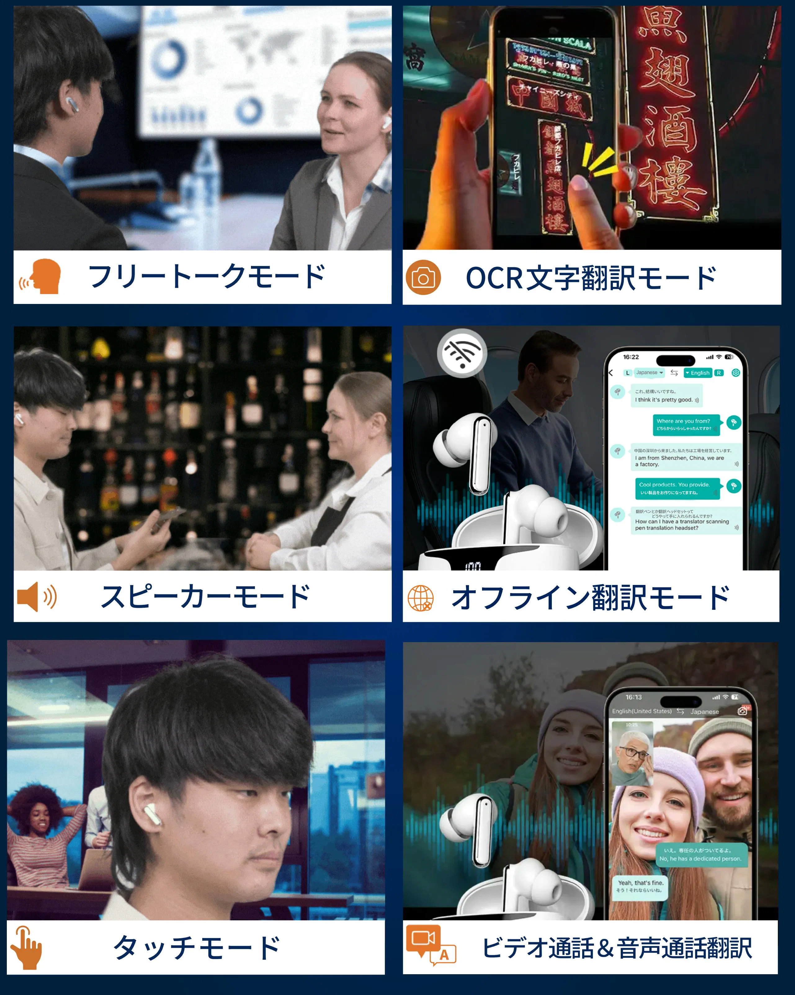 使いたいシーンに合わせて6つの翻訳モードが使えて、高音質設計だから、どこにいてもまるで会議室にいるような快適性が高い会話が実現。