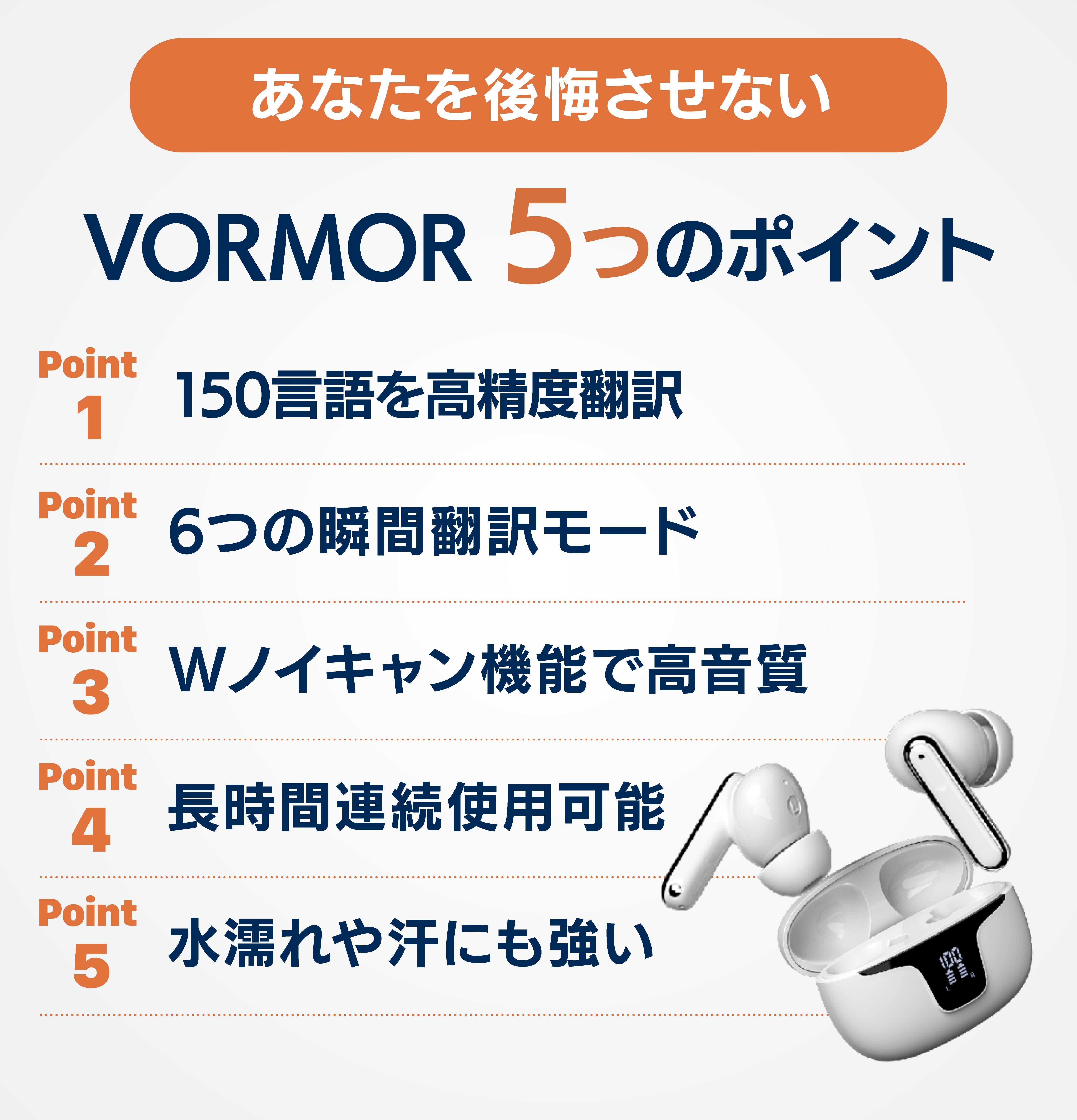 VORMOR Smart Translation Earphones V49(以下、V49)は、言語の異なる外国人とのコミュニケーションで150言語を瞬時に相互翻訳しながら、周りの騒音をカットするAIイヤホン型翻訳機です。