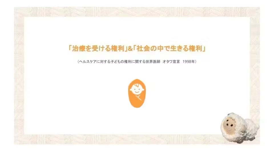 また、小児がんの子どもたちも、生まれながらに自由で平等な“人“としての権利を持ち、また「治療を受ける権利」と「社会の中で生きる権利」を持っています。(ヘルスケアに対する子どもの権利に関する世界医師オタワ宣言 1998年)つまり、重病を抱える子どもたちも、他の子どもたち同様、学校に通い教育を受ける権利と、社会生活をする権利を持っているということです。