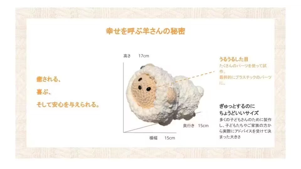 幸せを呼ぶ羊さんは「小児がんや重病の子どもたちに編みぐるみを贈ろう」プロジェクトのために完全オリジナルでデザインしました。(難解な編み方も使用しています。)羊にしたのは、羊が「かわいい、やさしい 、おとなしい、ふわふわ、やわらかい」という印象を持っているからです。沢山の動物園や美術館、図書館などを訪れデッサンを繰り返し設計図(あみ図)を製作しました。また実際に動物園で羊を見たときに「ずっしりしている」という印象も受けました。そして、今闘っている子どもたちに「羊の編みぐるみ」を贈ることが、私がみなさんにご支援をいただいてできる、私たちにしかできないプロジェクトだと確信しています。(これまでのプロジェクトにおいて、編みぐるみを贈ったのちに返ってくる、子どもたちやご家族の方々の喜びの声でも、幸せを呼ぶ羊さんが一番良いと確信しています。)今、この時も小児がんや重病と診断されその事実を受け入れ、家族と離れ本当に辛い治療に向かい合っている子どもたちがいます。またその子どもたちのきょうだいや家族も一丸となって小児がんに挑んでいます。私もステージ4の大腸癌なので抗がん剤化学療法や入院、手術の辛さは毎日のように感じていますが、その辛さを子どもたちが味わっていると思うと心臓を抉られるような思いになります。そして1日に何回も「そんな子どもたちのために、私に幸せを呼ぶ羊さんを作り贈らせてください!」と祈ります。そして、このプロジェクトを通して、少しでも多くの重病の子どもたちの笑顔が増えて欲しい。子どもたちに、喜びと安心、そして生きる力をプレゼントしていきたい。 沢山の小児がんの子どもたちや、小児がんを克服して新たな人生を歩み出している小児がん経験者の方々、あなたの「熱い思い」と「祈り」が必要です。そして「あなたがいる!」、「私はひとりじゃない!」ということを知ることは、子どもたちの安心へとつながります。「小児がんや重病の子どもたち」、そして「私」には、今、そしてこれからも、あなたの「お支え」と「熱い思い」が必要です。小児がんや重病の子どもたちの事実と現状を私たちがもっと知り、子どもたちへ生きる力と喜びをプレゼントできるような社会。また子どもたちが「私たちの味方や支えてくれる人が沢山いるんだ」と安心し、苦しい闘病生活の中でも強く頑張れる社会が来ることを願います。どうぞお支え、ご支援よろしくお願いいたします。
