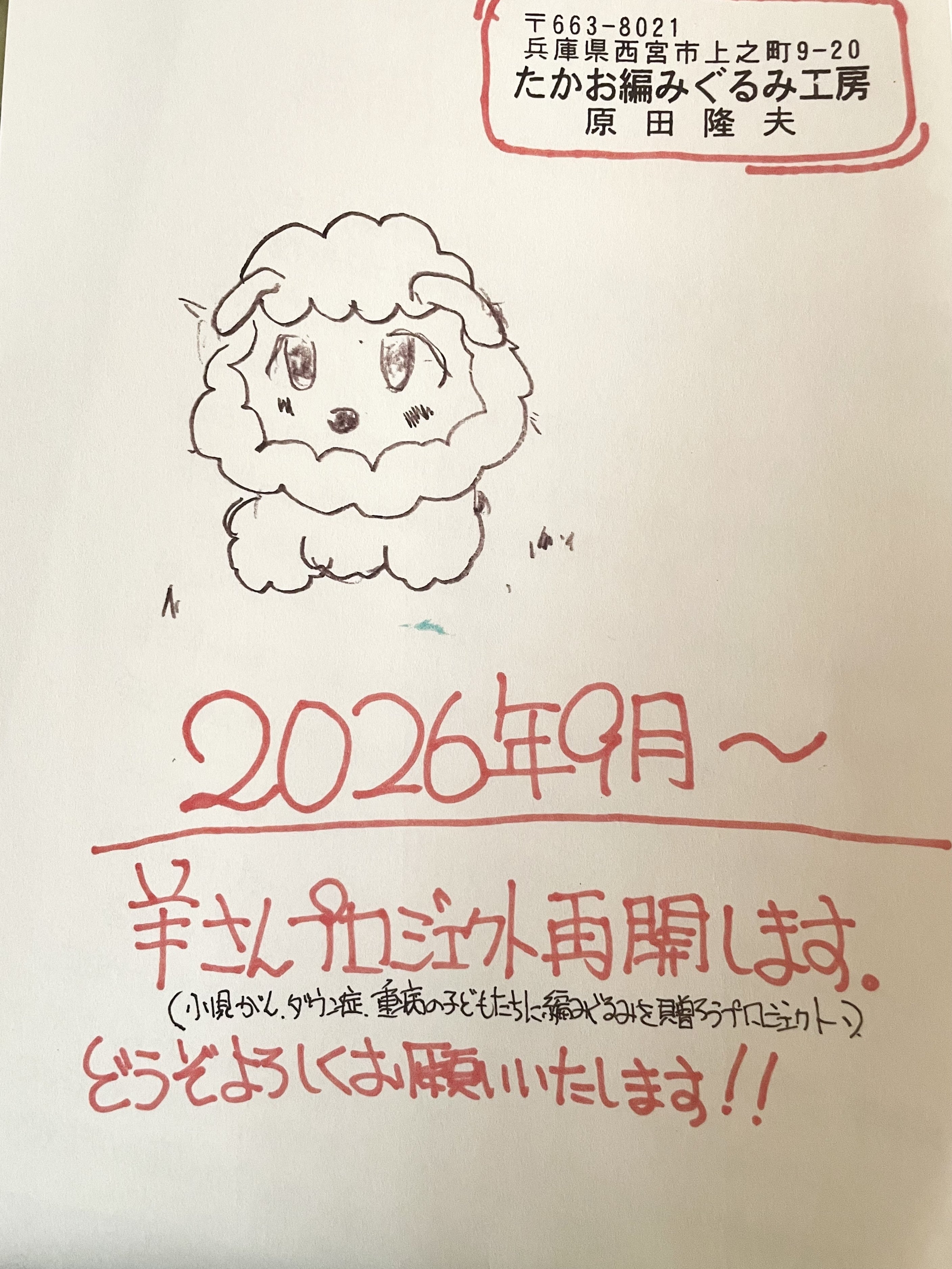 どうか今、そしてこれからも、子ども達に“たかお編みぐるみ工房“の「幸せを呼ぶ羊さん」をプレゼントすることのご支援をよろしくお願いいたします。