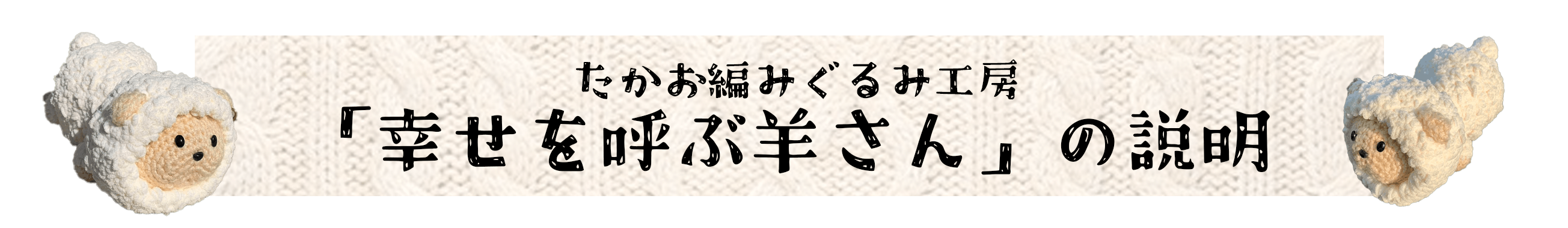 - たかお編みぐるみ工房の「幸せを呼ぶ羊さん」は編みぐるみ作家の原田隆夫がイチカラ設計、製作している完全オリジナルの編みぐるみです。たくさんの毛糸で試作を重ね、たどり着いたシェニールという毛糸をつかっているので手触りはフワフワ、ぎゅっと抱きしめたくなる質感です。・