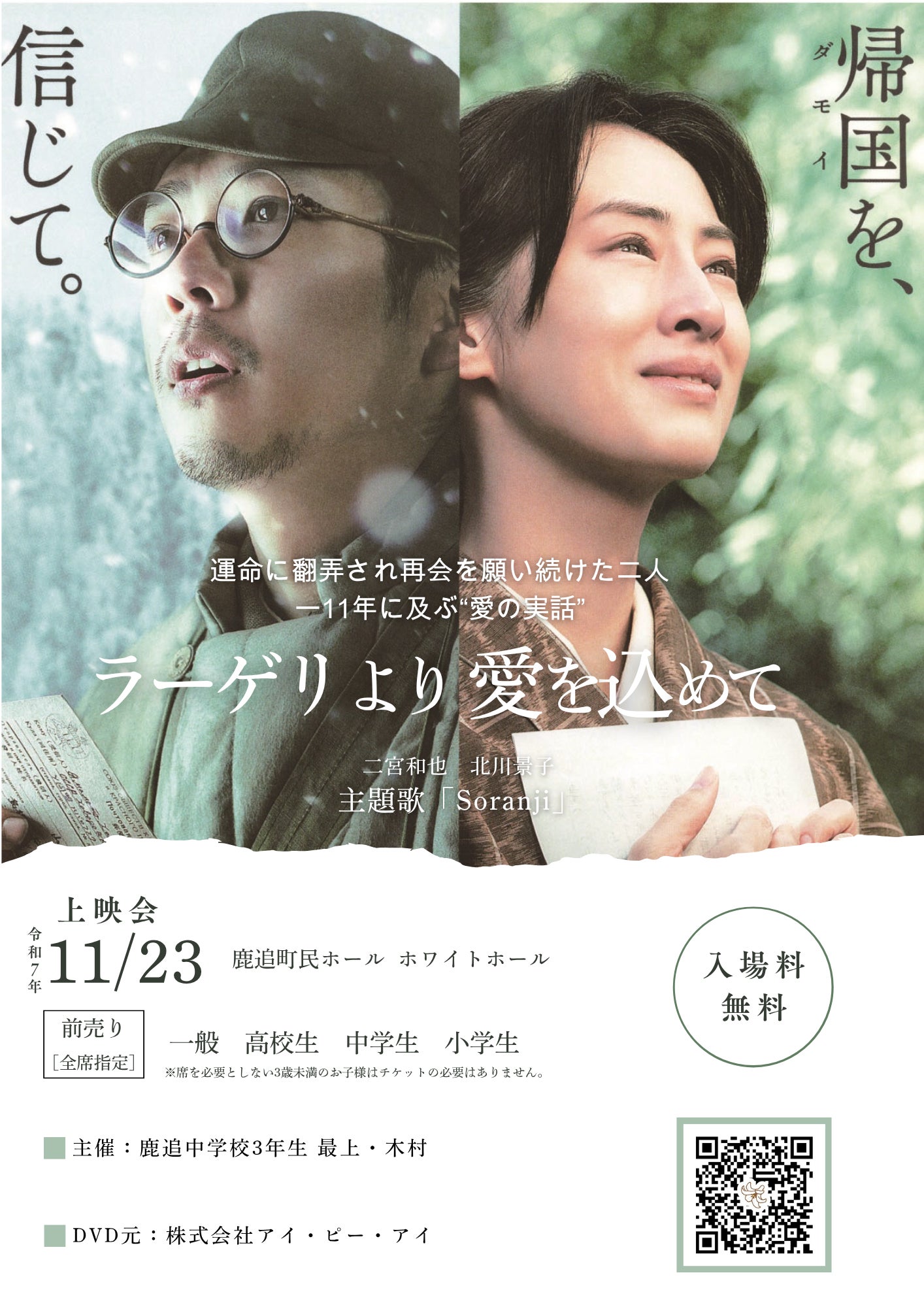 すでに町民ホールの会場予約を済ませました。上映映画は町内アンケートにより「ラーゲリより愛を込めて」という映画を選びました。この映画は戦争に関する内容で、みんなで観ることで平和の大切さや、家族・仲間について考えるきっかけになればと思います。上映会のサイトやチケット、ポスターもデザインして作成しました。今後は広報やサイトを通じて地域の皆さんにお知らせをしていきます。