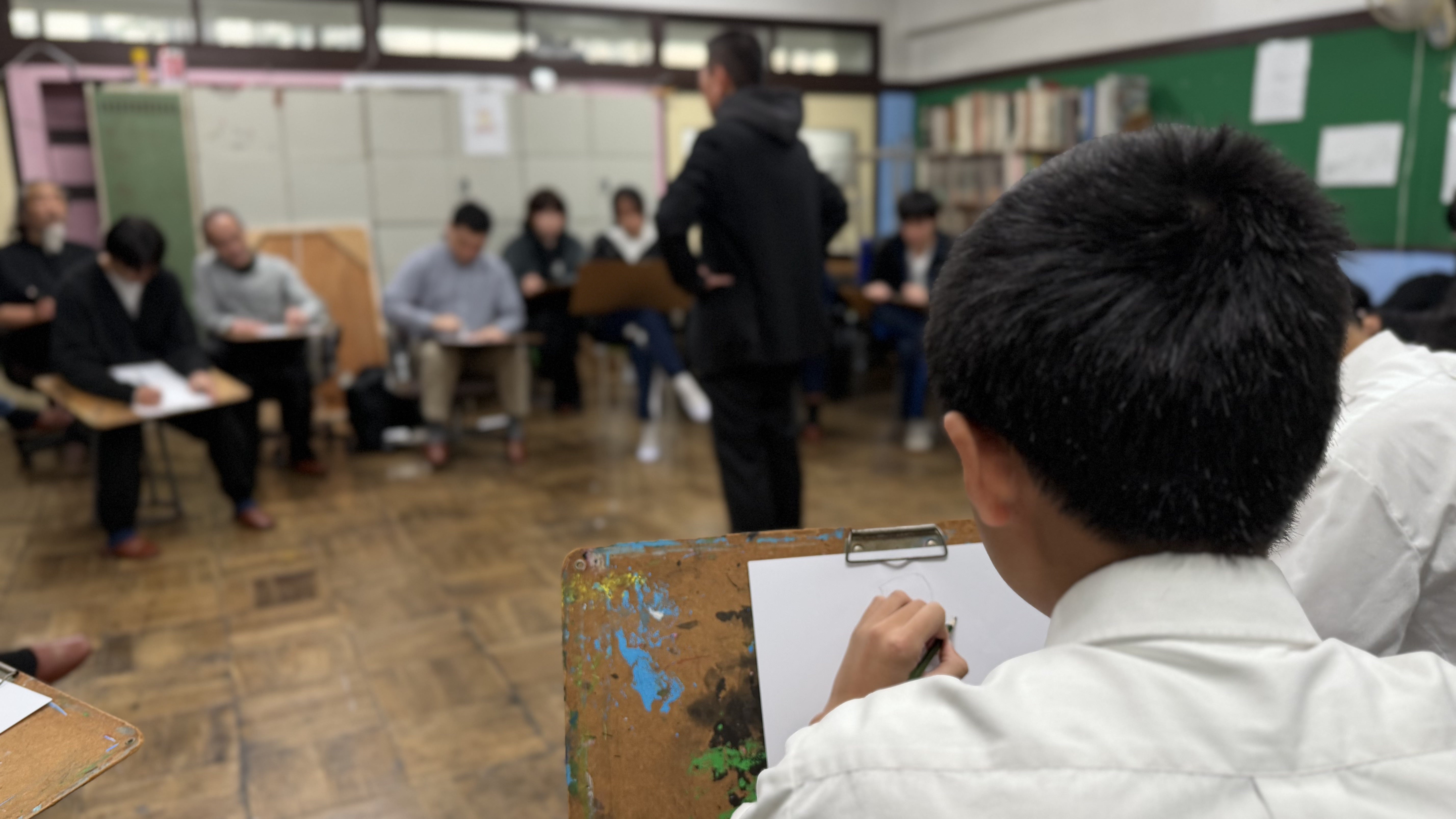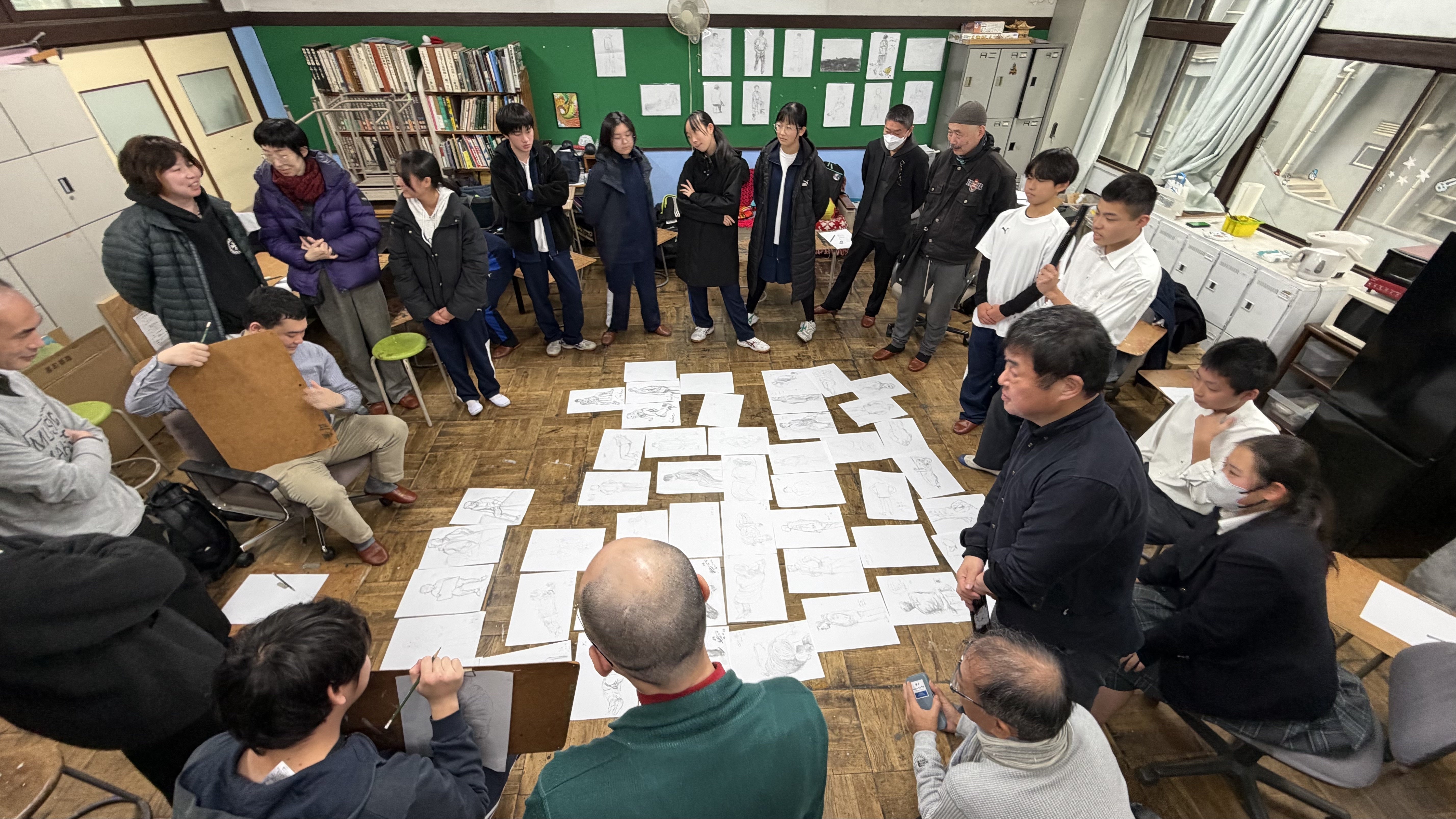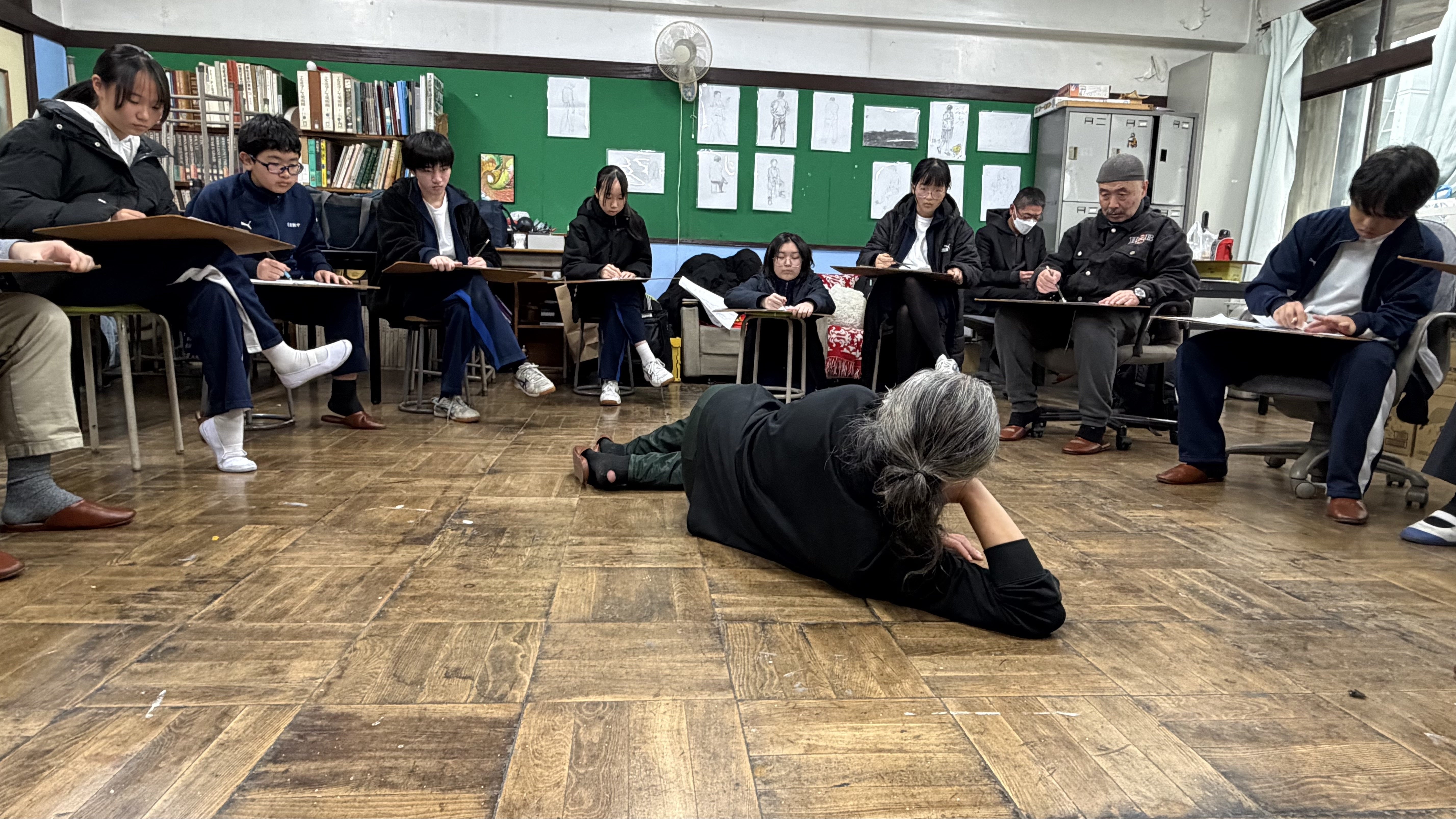 そして、普段生徒さんたちが部活の冒頭で行っているという「クロッキー」(モチーフを短時間で簡潔に描くこと)を行っている様子を見ていただきました。