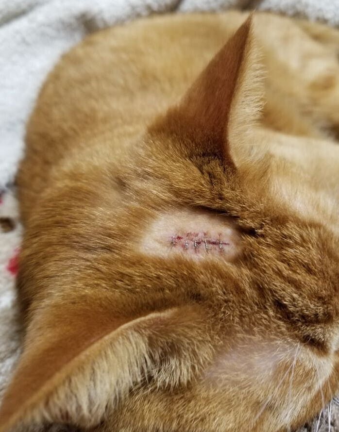 幸いなことに頭部の腫瘍が大きくなかったのと、現在の体では全身麻酔に耐えられない可能性があるとのことで、局所麻酔で治療を行うことになりました。