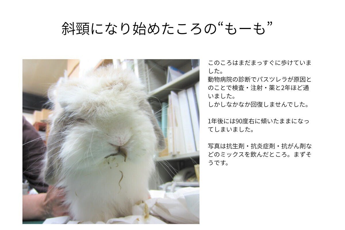 もーもはすごく明るい性格で斜頸になってからあまり歩くことができずすぐに転んでしまっていました。しかし手足をバタバタさせて何とか自力で起き上がり少しずつ前に動いていました。このころの合言葉は“1歩前へ”。ひっくり返ってもそのまま毛づくろい。なにごとにもめげない性格は飼い主を勇気づけてくれました。