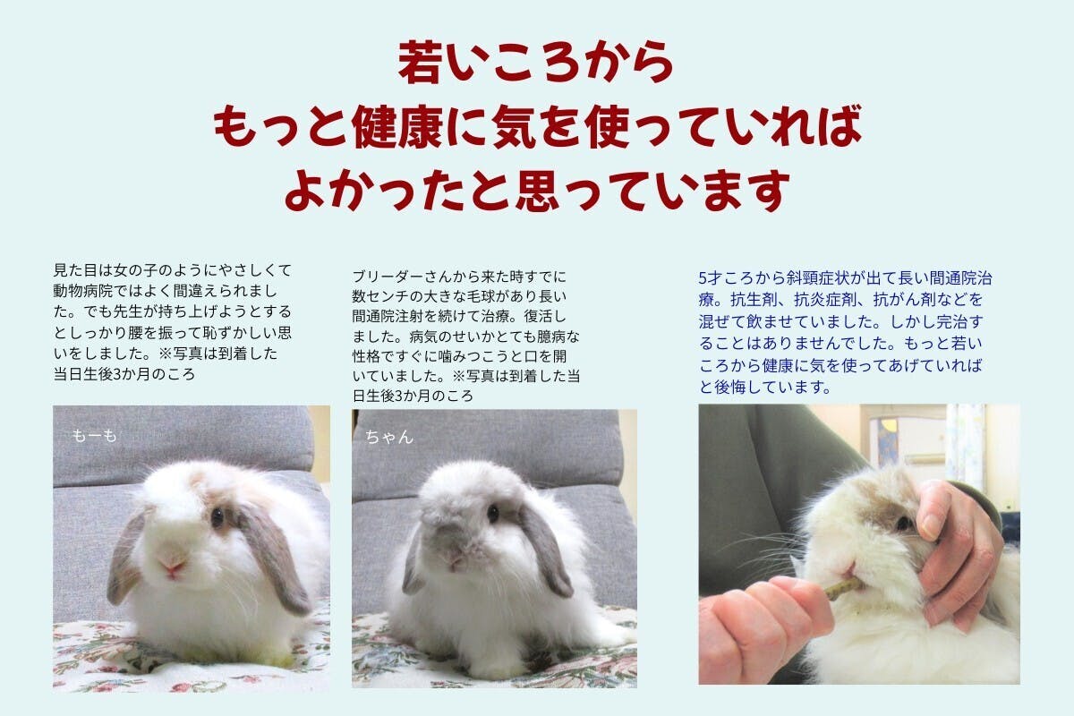 健康食品では、毛球症対策、乳酸菌整腸、スナッフル対策、栄養強化食などの商品が次々と登場し、ペットうさぎの健康促進、長寿命化に貢献しています。さらにもっとうさぎが健康で長生きできるようにしたいと願っています。