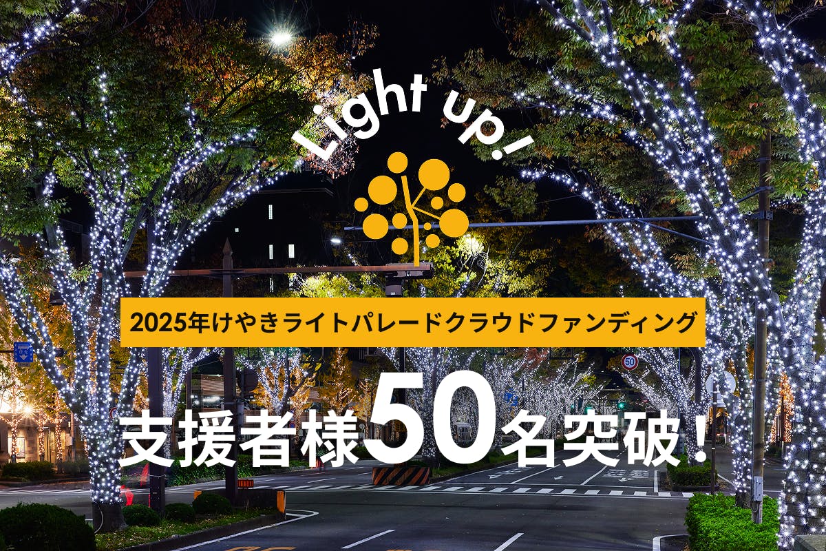 2025/11/19 16:37いつも「けやきライトパレード」、ならびにクラファンプロジェクトを応援いただき誠にありがとうございます!本日、支援者数が50名を突破いたしました。まずは、この取り組みに共感し、背中を押してくださった皆さまへ心より御礼申し上げます。今年で3年目となるライトアップですが、毎年楽しみにしてくださる地元の方々、初めて知って興味を持ってくださった方々、そして遠方から応援してくださる方々など、さまざまな温かいお気持ちが集まり始めています。皆さま一人ひとりのご支援が、冬のけやき大通りを明るく照らす光そのものとなっています。現在点灯式準備の真っ最中!皆さまにより良い形で灯りをお届けできるよう、スタッフ一同取り組んでおります。引き続き、温かい応援・シェアのご協力をいただけますと大変励みになります。いよいよ11月23日にけやきライトパレード開始!今年も11月23日から「けやきライトパレード」が始まります。ぜひ今年もイルミネーションをお楽しみください!今年はさらにスケールアップし、全長約3km・130万球のLEDによる、日本一のイルミネーションが完成します!このところぐっと寒くなってまいりました。どうぞ皆様暖かくしてお過ごしください。それでは、11月23日、けやきライトパレードの光の下で皆さまとお会いできることを楽しみにしております! もっと見る