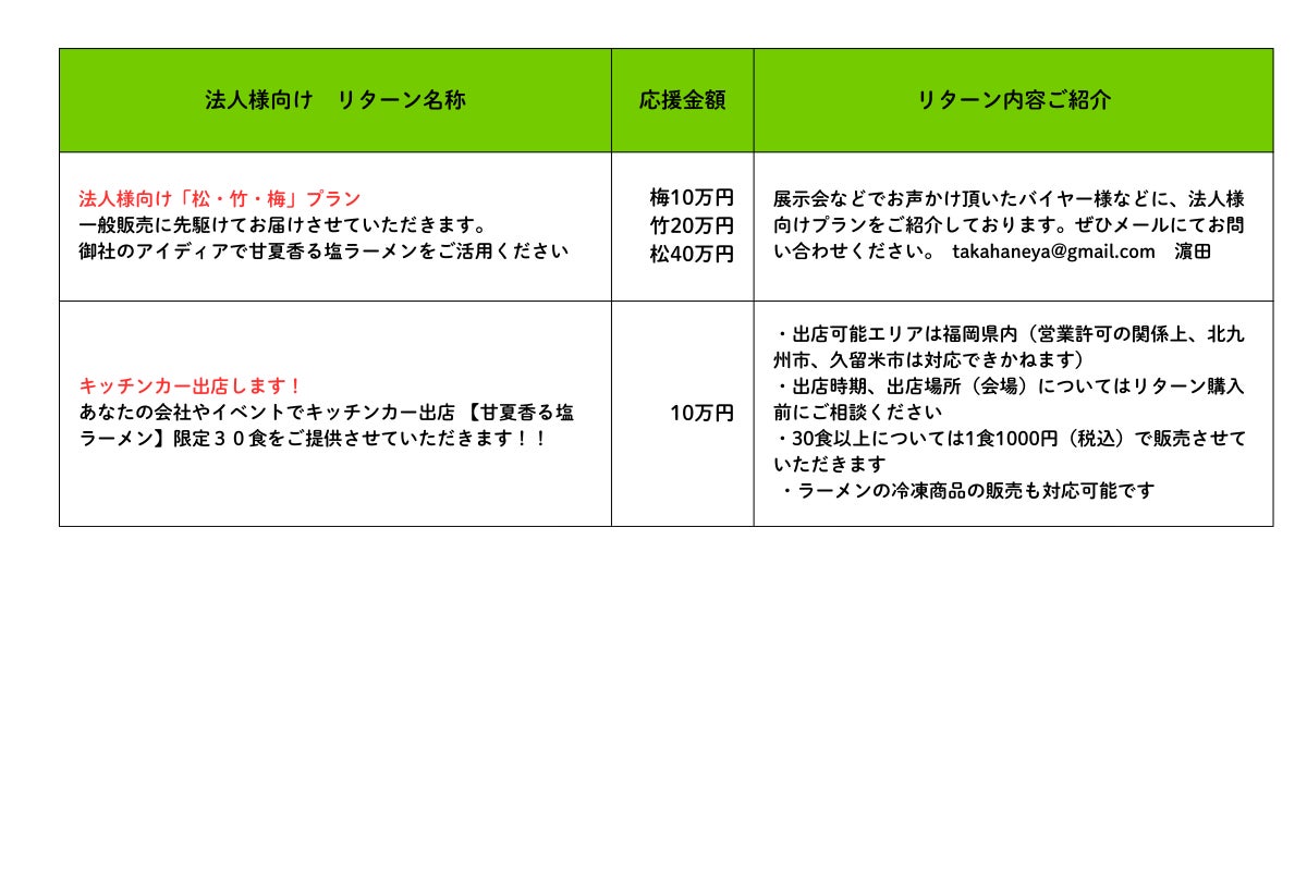 今回のゴールのひとつ「冷凍ラーメンの商品開発と鷹羽屋キッチンカーの仕様変更」で甘夏キャラバンに繰り出し、各地の美味しいをつないでいくきっかけを作りたいと思っていますので、みなさんぜひお力をお貸しください!よろしくお願いいたします!