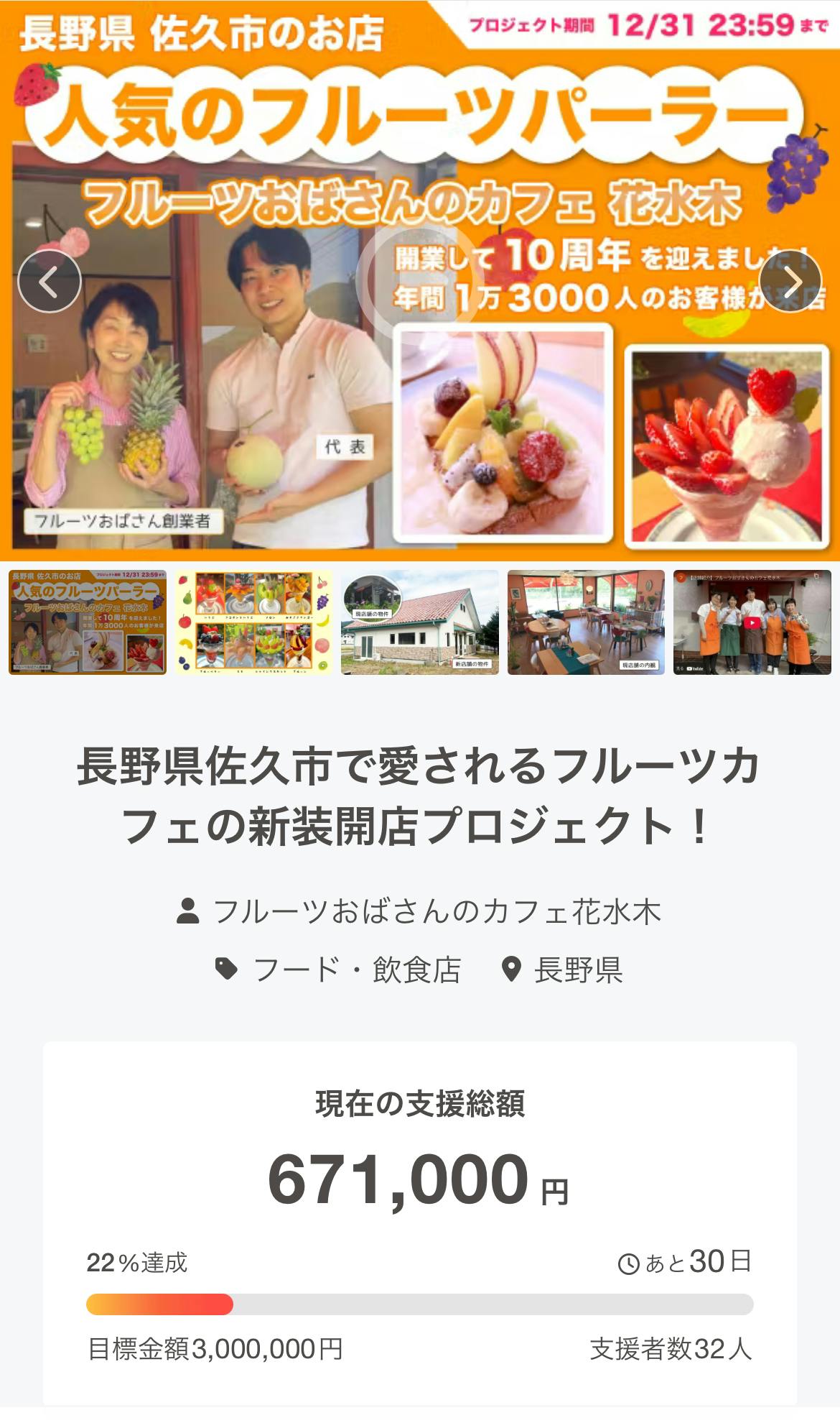 こんにちは!フルーツおばさんのカフェ花水木です当店は移転に伴う改修費用のご支援を募っております。新店舗の改修には 最低でも約1,500万円 が必要となり、自己資金だけではどうしても賄いきれない状況です。これまで長く愛してくださった現店舗の雰囲気にできるだけ近づけつつ、より快適に過ごしていただけるお店をつくりたいという思いで、このプロジェクトに挑戦しています。おかげさまで現在、71万円・37名の方にご支援いただきました!心から感謝しております。本当にありがとうございます。残り1か月を切りましたが、最後まで全力で走りきりたいと思います。引き続き、ご支援・応援のほどどうぞよろしくお願いいたします。