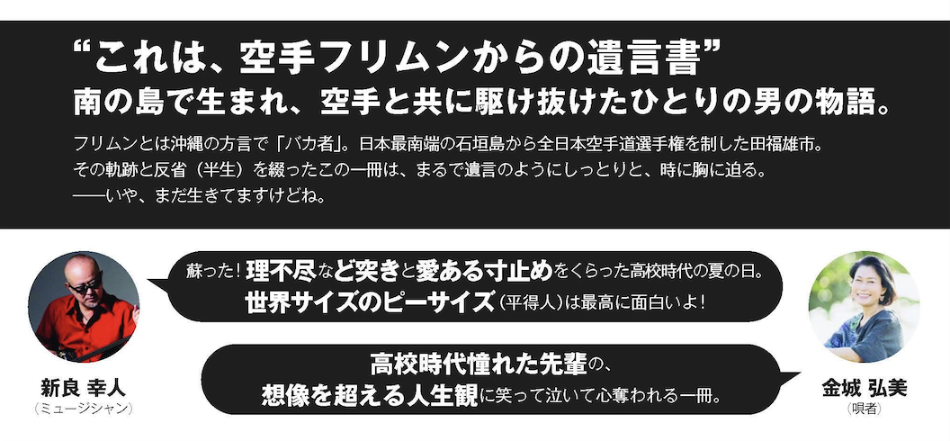 著者・田福雄市の高校時代の後輩であり、今や全国的に知られるミュージシャンの新良幸人さん、そして同じく高校時代の後輩で八重山を代表する唄者の金城弘美さん、さらに著者の娘で唄者の田福真美さんより、書籍に花を添える素敵な帯コメントをいただきました!