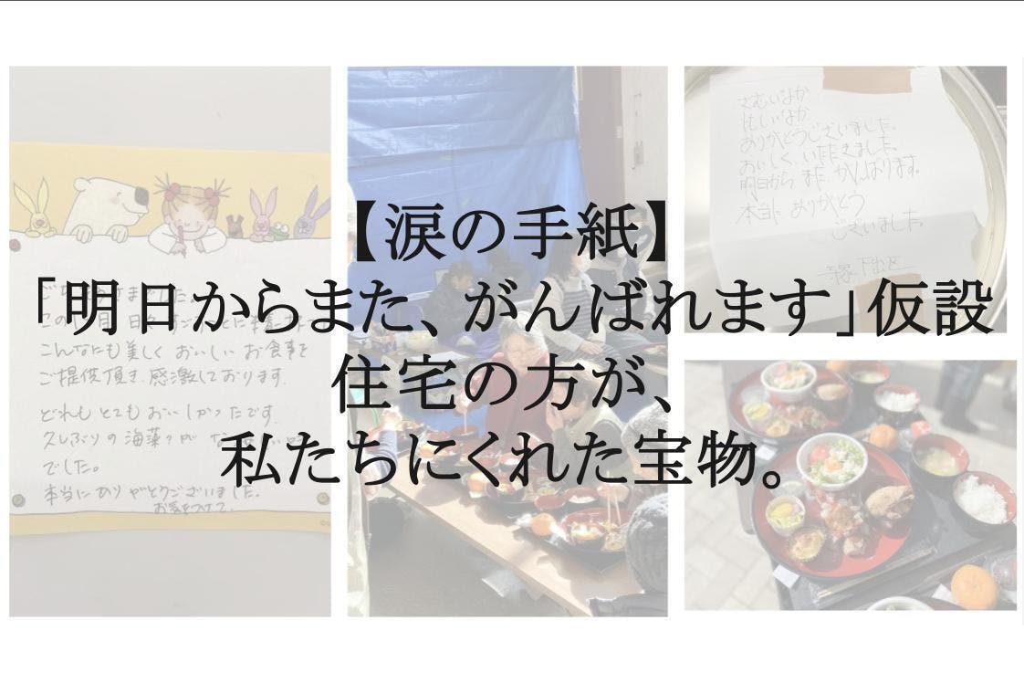これは、私たちが炊き出しに行った仮設住宅の方々からいただいた、手書きのお手紙と、食事の風景です。