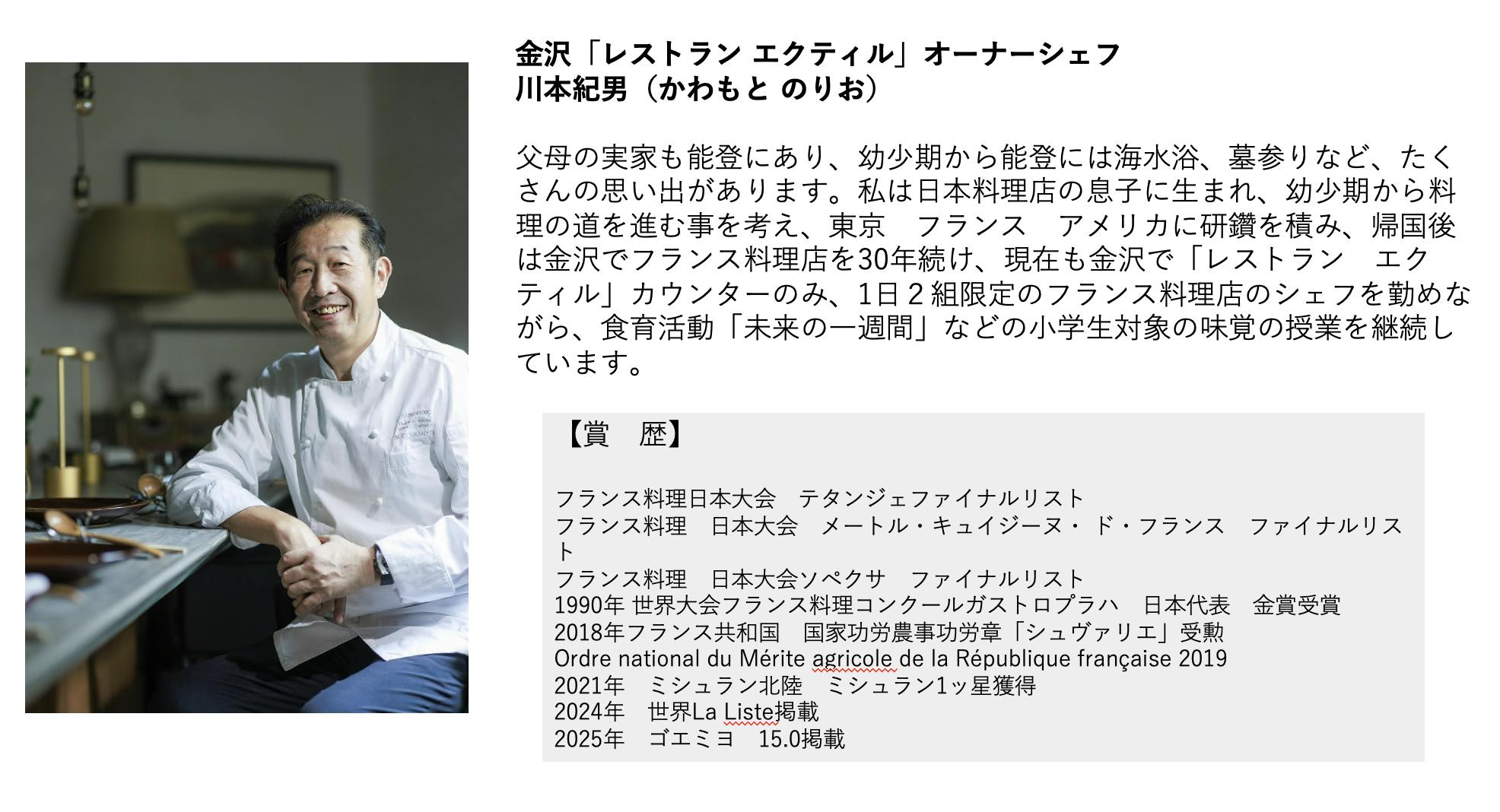 プロジェクトの中心となるのは、フレンチの重鎮 川本 紀男シェフ今回は、全国のシェフ仲間と共に「走る食文化拠点」を立ち上げる挑戦を始めます。多くのシェフから、能登の自然や食材の魅力に惹かれ、能登を訪ね、食材を使用いただいています。地域の食材を世界基準にまで高めるだけでなく、子どもたちに食の大切さを伝える「食育活動」にも力を注いでいます。