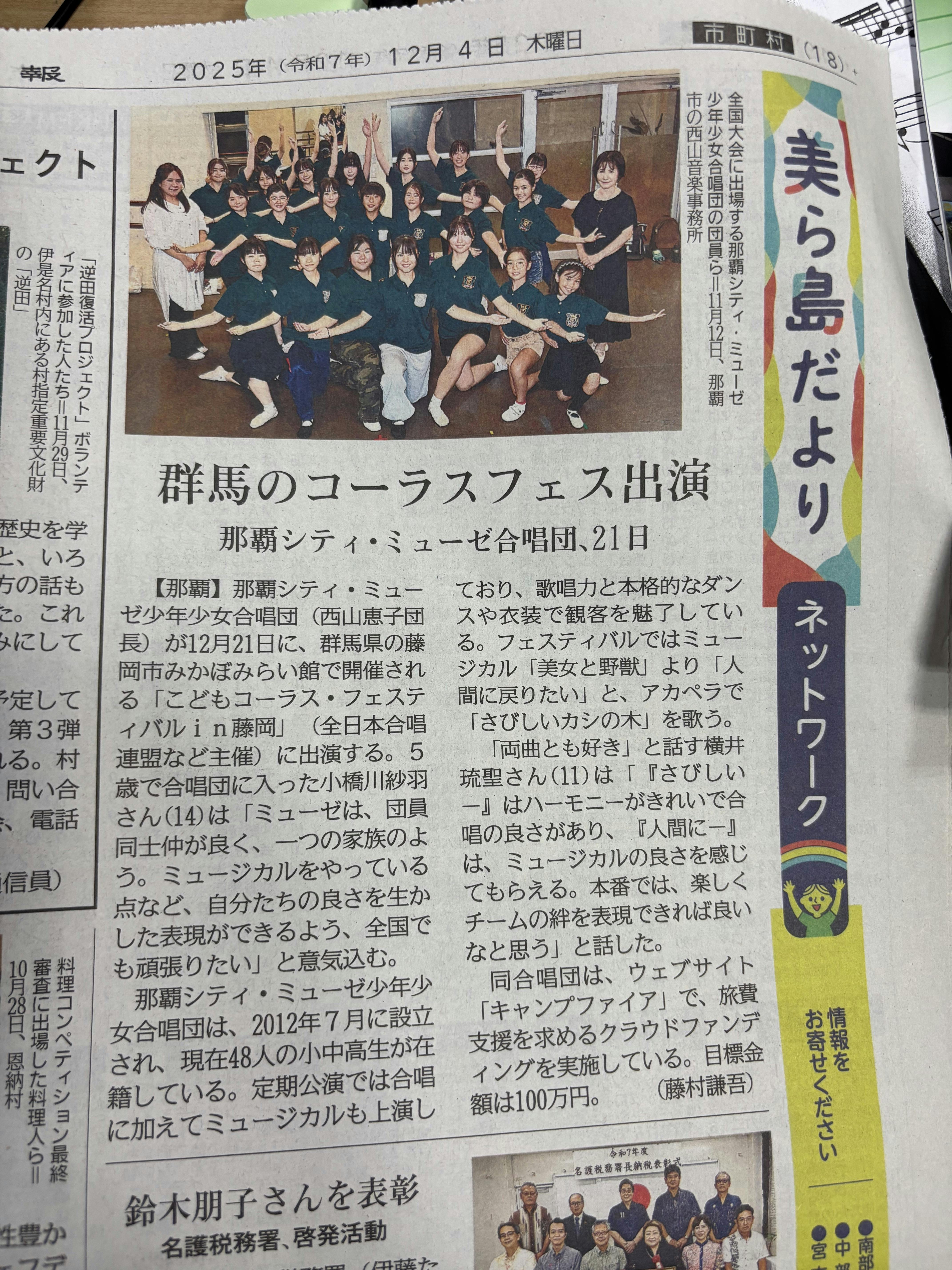 琉球新報の「美ら島だより」のページに画像付きで掲載して頂きました。