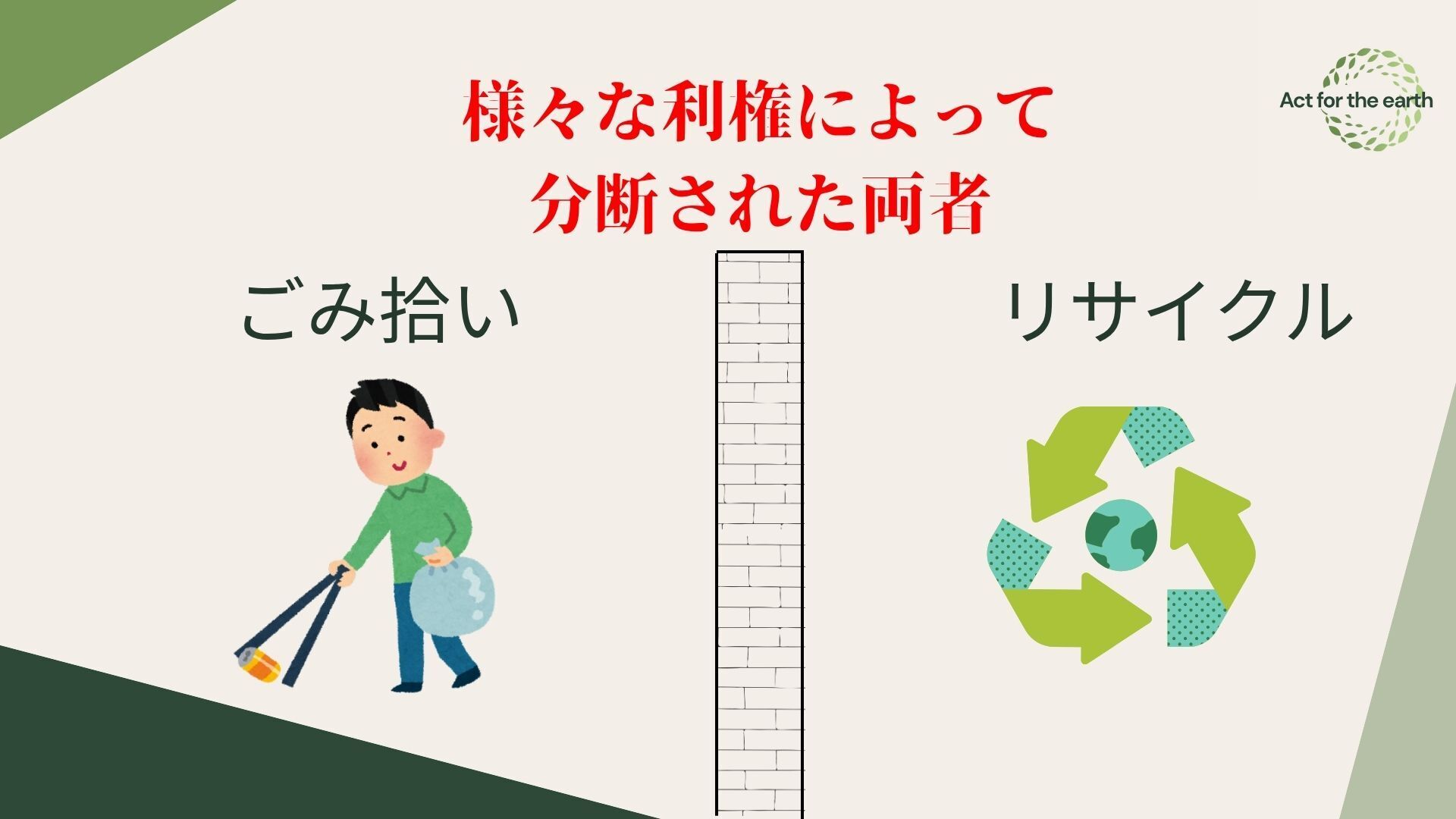 しかし、私たちAct for the earthは現在のごみ拾いイベントは不完全であると考えています。それは、集めたごみの行き先が明示されていない点です。リサイクルの必要性が広く訴えられ、家庭でもごみの分別が普通となって現在でもなお、ごみ拾いイベントで集めたごみの行き先は不透明となっています。リサイクルとごみ拾いは無関係ではないはずなのに、両者は完全に分断されてしまっているのです。