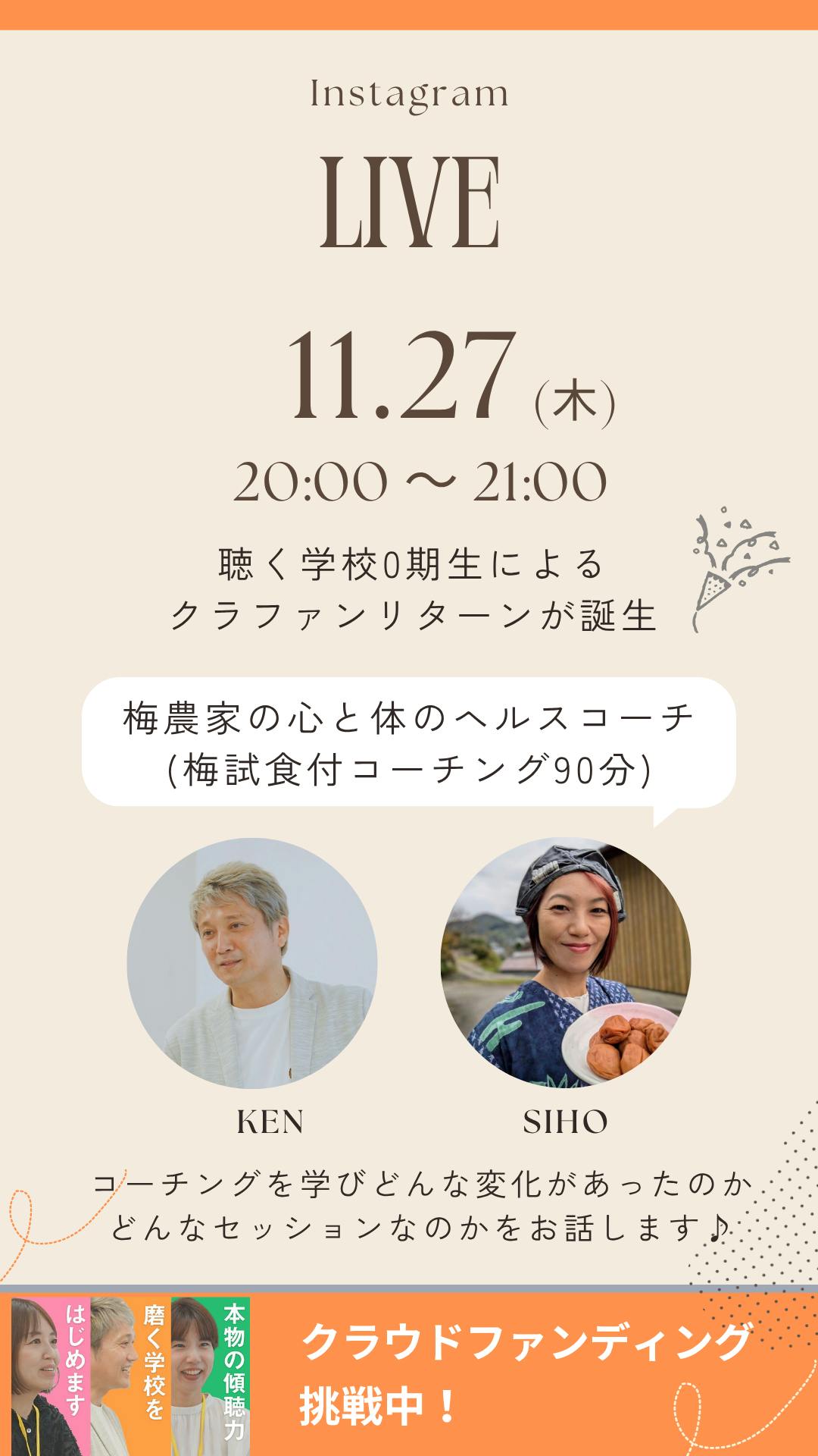 2025/11/21 09:00いつも『聴く学校』を応援いただきありがとうございます!本日、新しいリターンが追加されました!今回は 聴く学校0期生からのリターン です。⸻〈聴く学校0期生プラン〉梅農家の心と体のヘルスコーチ梅試食付き/90分コーチングセッション梅干しは、「塩」と「時間」をかけて腐らずに熟成する発酵食。コーチングも同じように人生の痛みや経験を「時間と対話」を通じて自分の色へ熟成させていくプロセス。心と体のバランスを整え、丁寧に生きるためのヘルスコーチングです。このプロジェクトに関わるみんなが、それぞれの強みを持ち寄って「聴くをひろげる輪」を作っていきたいそんな想いから生まれたリターンです。ぜひチェックしてみてください!https://camp-fire.jp/projects/891587/backers/new?id=1551250⸻11/27(木) 20:00〜 Instagramライブ決定!『聴く学校0期生による新リターン誕生ライブ』・ 0期生がなぜコーチングを学んだのか・ どんな変化があったのか・ 今回誕生したリターンはどんな内容なのかリアルにお話しします♪ちょっとでも気になる方、ぜひ覗きに来てください^^♪⸻「聴く学校」は、わたしたちだけで作るものではなく“関わるみんなで育てていく学校” です。引き続き応援いただけると、とても励みになります。いつも本当にありがとうございます! もっと見る