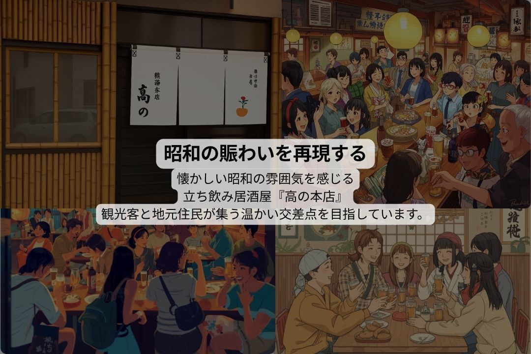 目指す姿:昭和のような、でも令和に似合う小さな居酒屋。観光客と地元住民が自然に交流できる、第二のふるさとのような場所