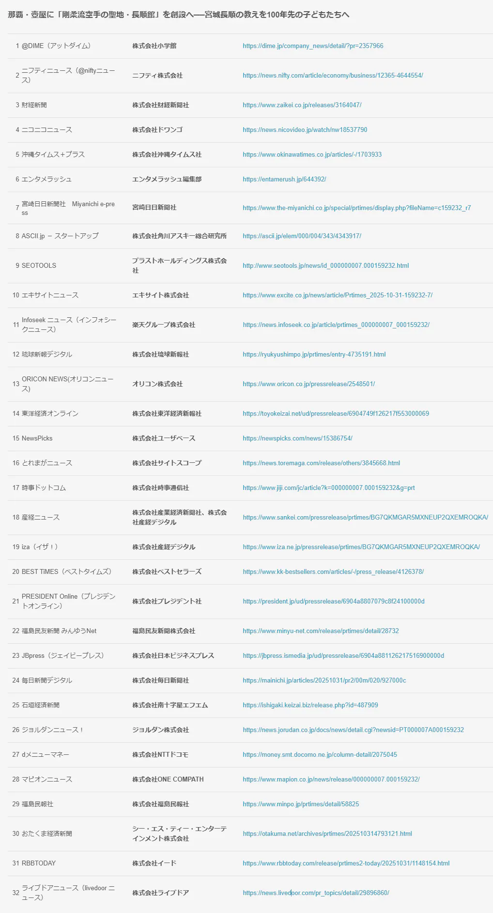 ・Yahoo!ニュース ・琉球新報デジタル ・沖縄タイムス+プラス ・時事通信(JIJI.com) ・Niftyニュース ・PRESIDENT Online ・毎日新聞デジタル ・ORICON NEWS ・DIME(小学館) ・Business Journal(ジョルダン) ・石垣経済新聞 ・NewsPicks ・Sankeiニュース ・Mapionニュース ・RBB TODAY ・livedoorニュース …他、合計 32メディアで掲載