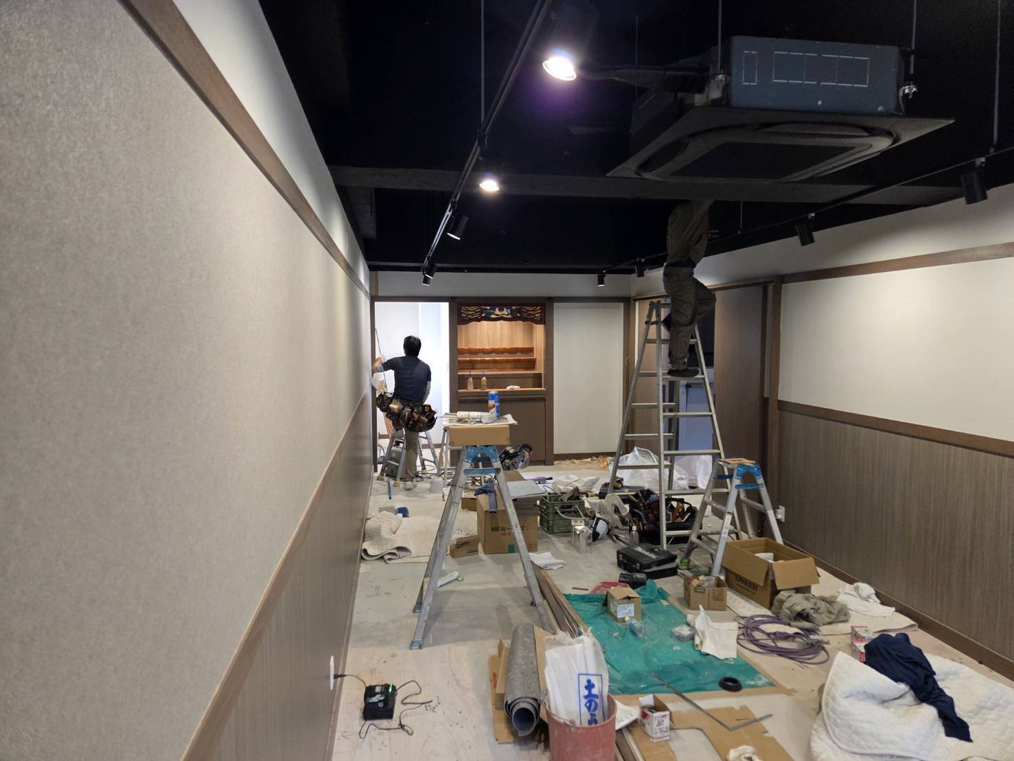 壁紙・木枠・天井照明・建具の取り付けが進み、いよいよ空間全体が“完成形”に近づいてきています。
