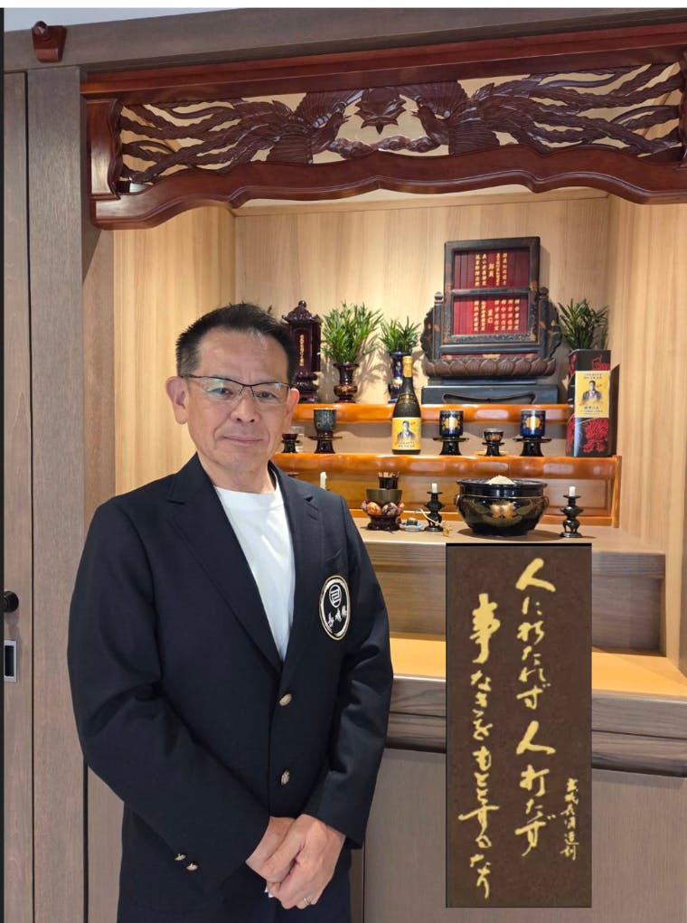 写真の背景にあるのは、祖父・宮城長順の位牌と、その教えである