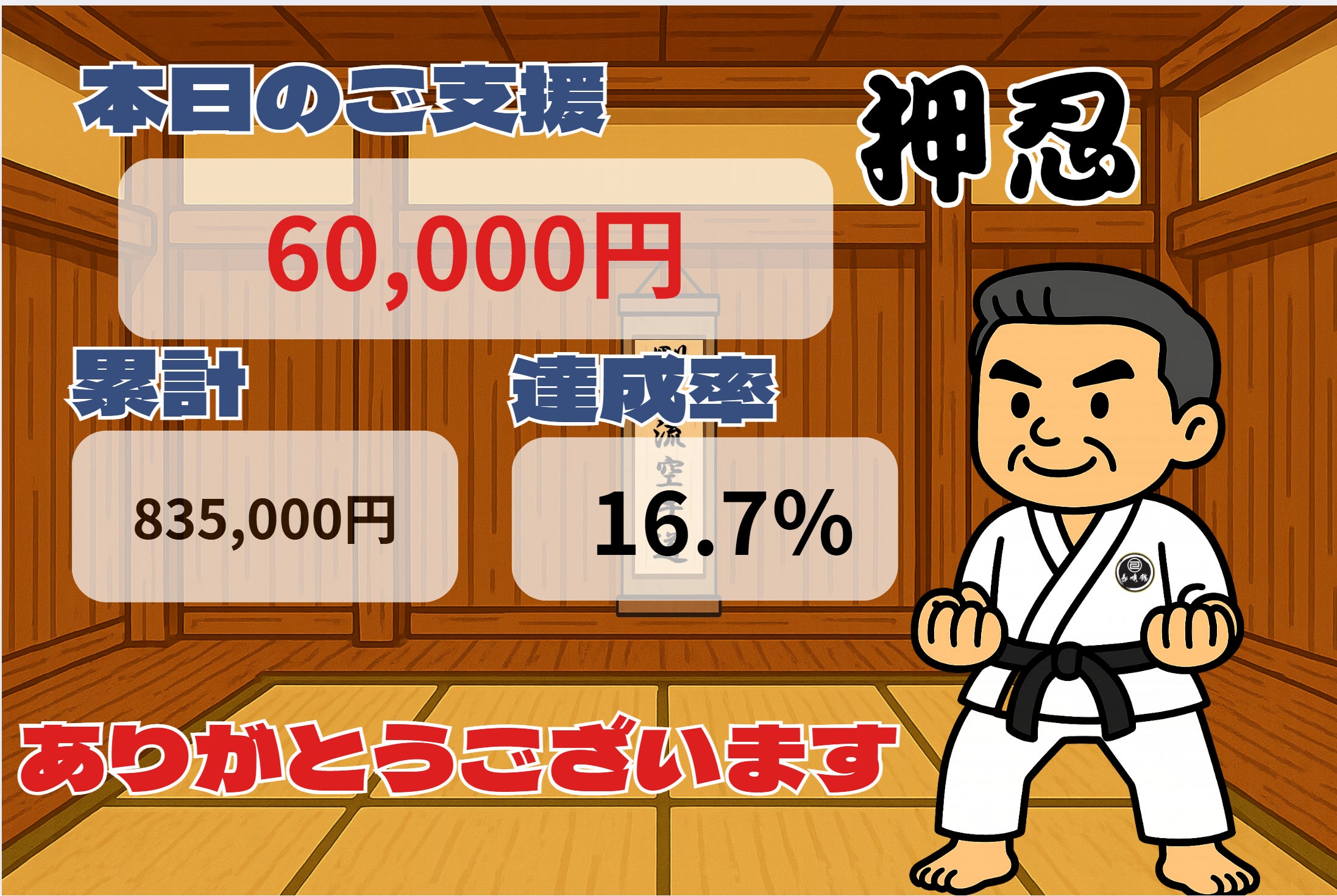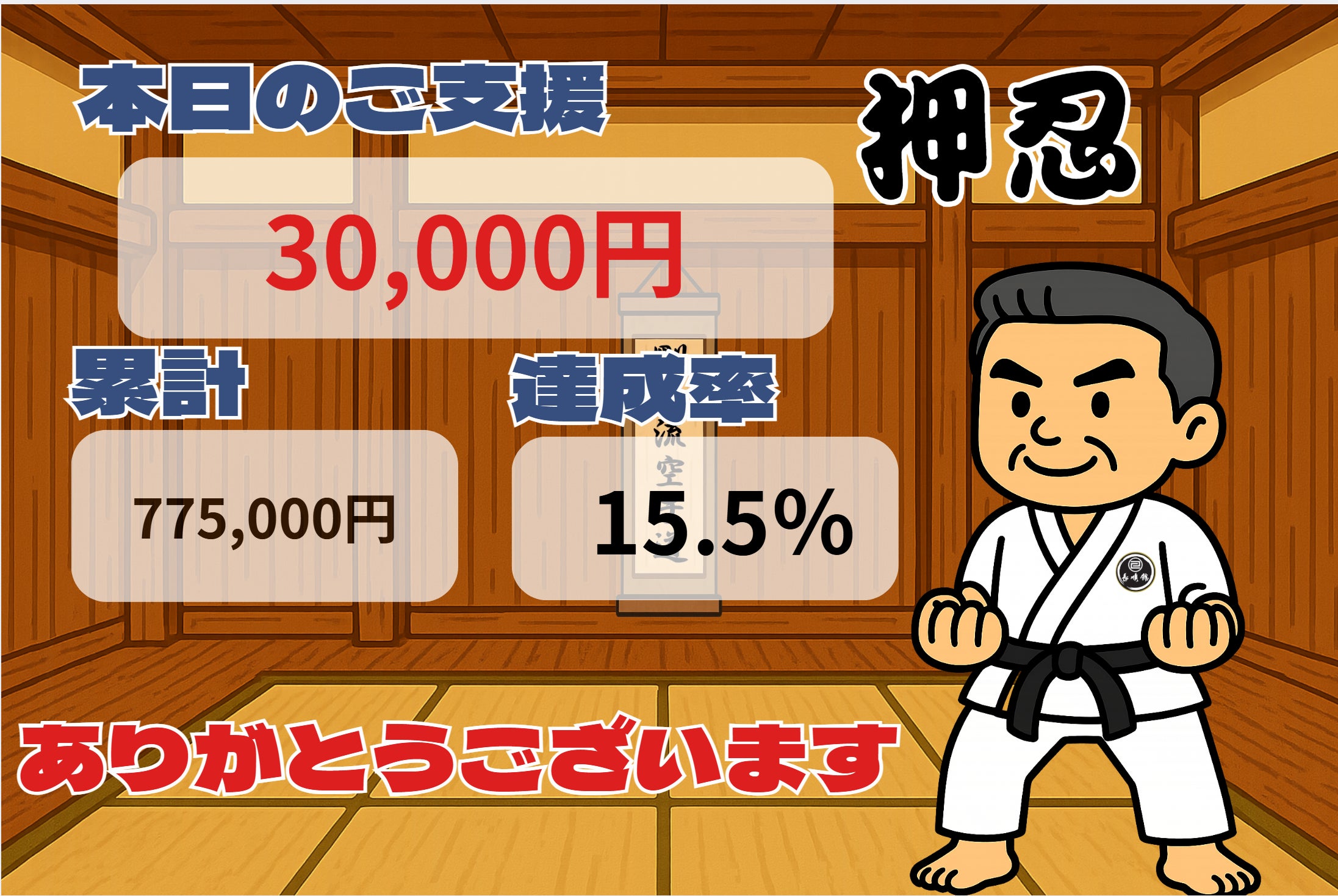 いつも温かい応援をありがとうございます。昨日のご支援は 60,000円、累計支援額は 835,000円(達成率16.7%) となりました。連休中日にもかかわらず、ご支援をお寄せくださった皆さまに心より感謝申し上げます。一人ひとりの想いが「長順館」実現への大きな力となっています。これからも、「剛柔流空手の祖・宮城長順師範の教えを未来へつなぐ」ために、地道に、そして誠実に活動を続けてまいります。引き続き、皆さまの温かいご支援とシェアをどうぞよろしくお願いいたします。