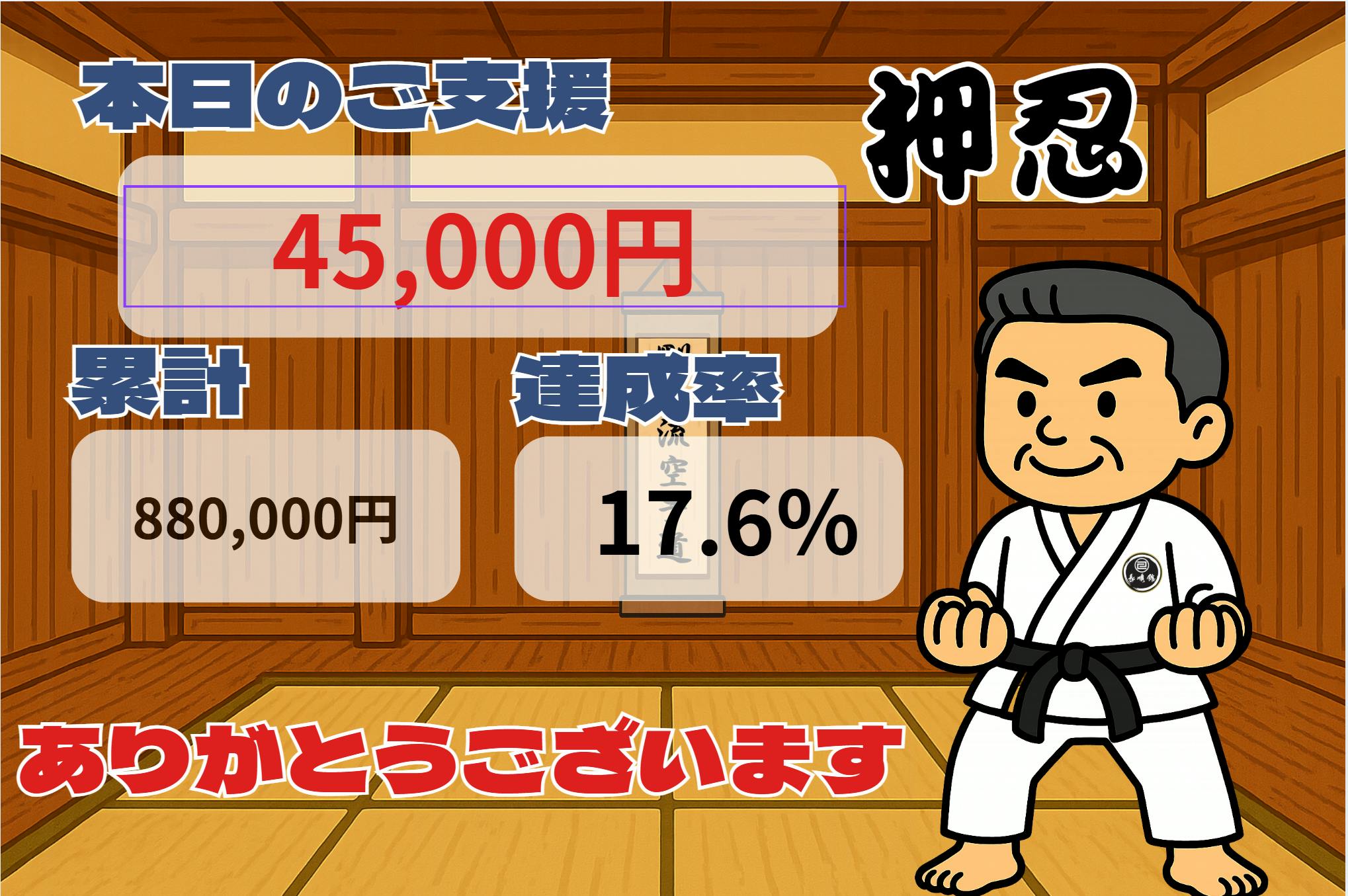 いつも温かい応援をありがとうございます。昨日のご支援は 60,000円、累計支援額は 835,000円(達成率16.7%) となりました。連休中日にもかかわらず、ご支援をお寄せくださった皆さまに心より感謝申し上げます。一人ひとりの想いが「長順館」実現への大きな力となっています。これからも、「剛柔流空手の祖・宮城長順師範の教えを未来へつなぐ」ために、地道に、そして誠実に活動を続けてまいります。引き続き、皆さまの温かいご支援とシェアをどうぞよろしくお願いいたします。