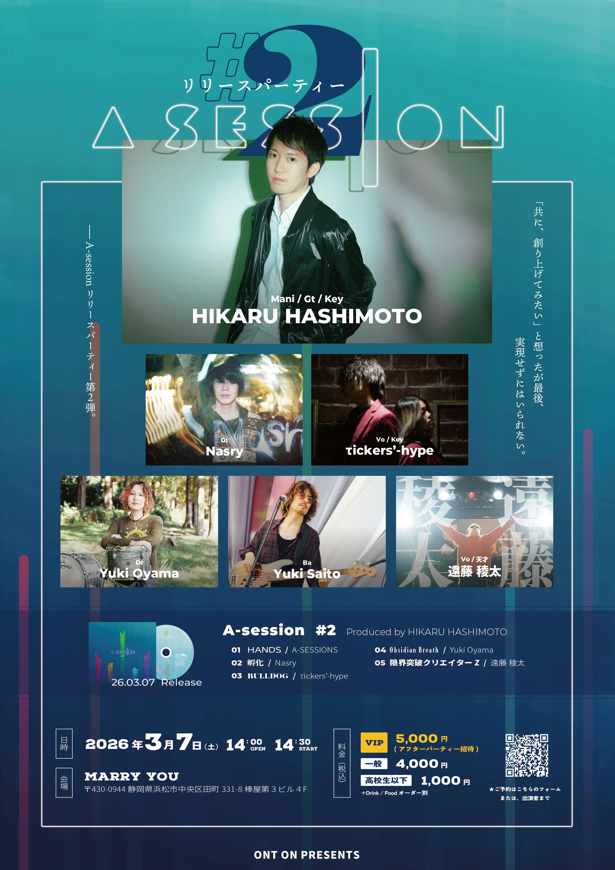 「A-session」とは、私HIKARU HASHIMOTOが、遠州のミュージシャンと一緒に、その人の代名詞となるような楽曲を制作し、それらの曲を収録したミニアルバムを制作する企画です。第一弾「A-session #1」では、5名のミュージシャンとの共作を2023年から開始し、2024年に各ミュージシャンに1曲ずつ、合計5曲が完成しました。2025年1月に開催したレコ発ライブは満員御礼となりました。