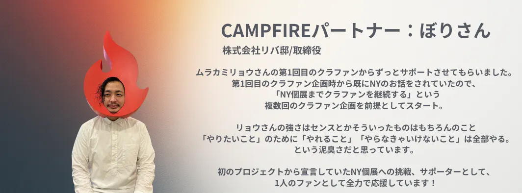 2026/02/09 14:21お疲れ様です!ムラカミリョウです!一点告知失礼します!この度、僕が代表を務める合同会社TAKIBIは株式会社CAMPFIREとパートナーシップを組む運びとなりました。今まで蓄積してきたクラウドファンディングのノウハウやメソッドを十分に活用し、企業や個人の資金調達に貢献する事業展開を行なっていきます。どうぞよろしくお願いします!!さて本題です◎現在目標100万円に対して、123万2600円(123%達成)ですっ!支援してくださった皆様、本当にありがとうございます。クラファン期限は2/17まで!(残り8日!)続々と支援いただける方が増えて嬉しい限り。令和の虎の放送もあって反響をいただいております!!そしてそして、今日最後のリターンをリリースしました!バレンタインチョコリターン!!!!!その名の通り、2月といえばバレンタイン!そのチョコ代わりのご支援をいただけないですか!というリターンです。最安値の500円から支援が可能になりました。是非支援してくださった全ての皆様の想いを乗せてNYに旅立ちたいと思います。最終日まで頑張りますのでどうぞよろしくお願いします!! もっと見る
