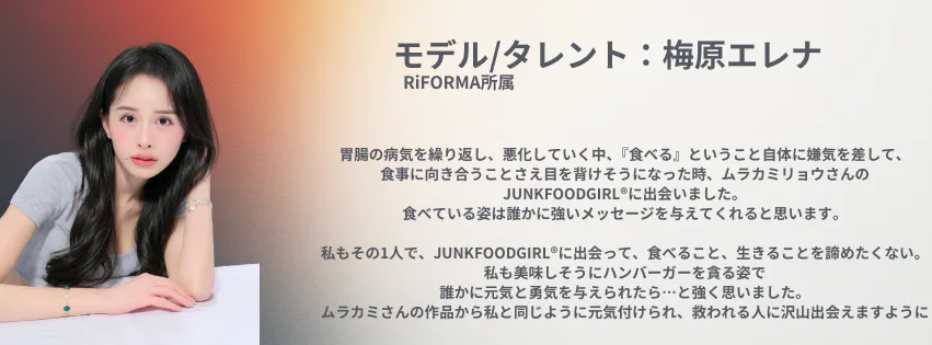 JUNKFOODGIRL®︎は単純に美しい写真展ではなくって、「我慢を美徳とする現代社会に、欲望に忠実になることの大切さ」というテーマを込めています。意外と深いでしょ。