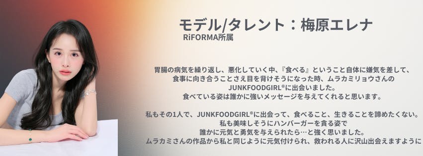 JUNKFOODGIRL®︎は単純に美しい写真展ではなくって、「我慢を美徳とする現代社会に、欲望に忠実になることの大切さ」というテーマを込めています。意外と深いでしょ。