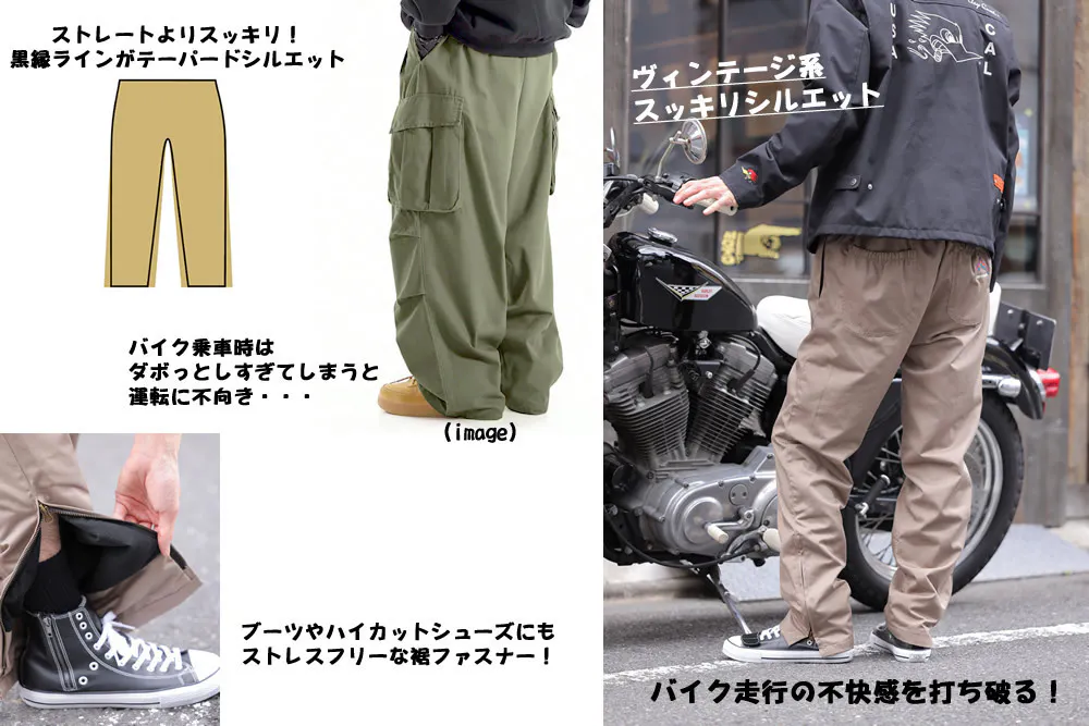 【裾はテーパー絞りスタイル】バイク乗車時に邪魔になりません。
