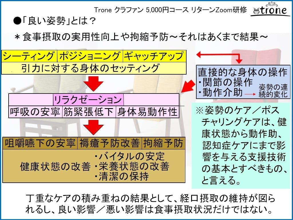 添付の図は、Zoom研修で使用する**「良い姿勢とは?」**を説明するプレゼン資料の一枚です。(リアル研修でも同様に使用します)