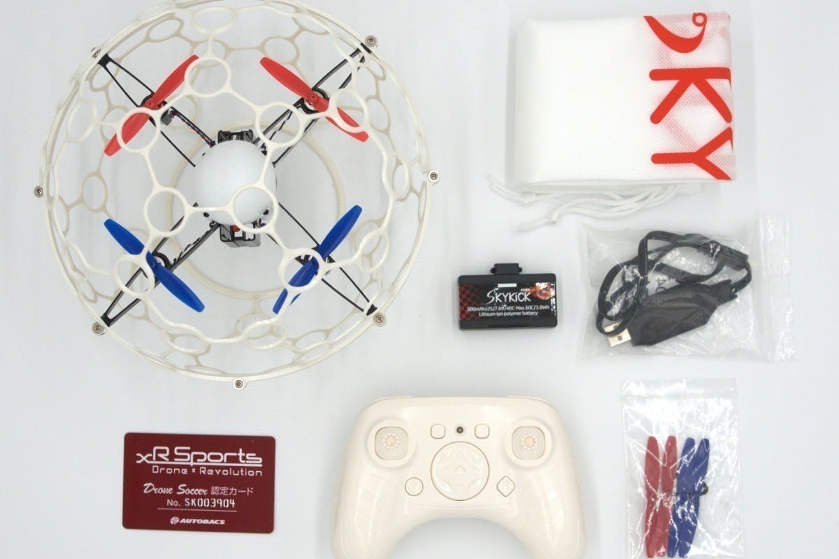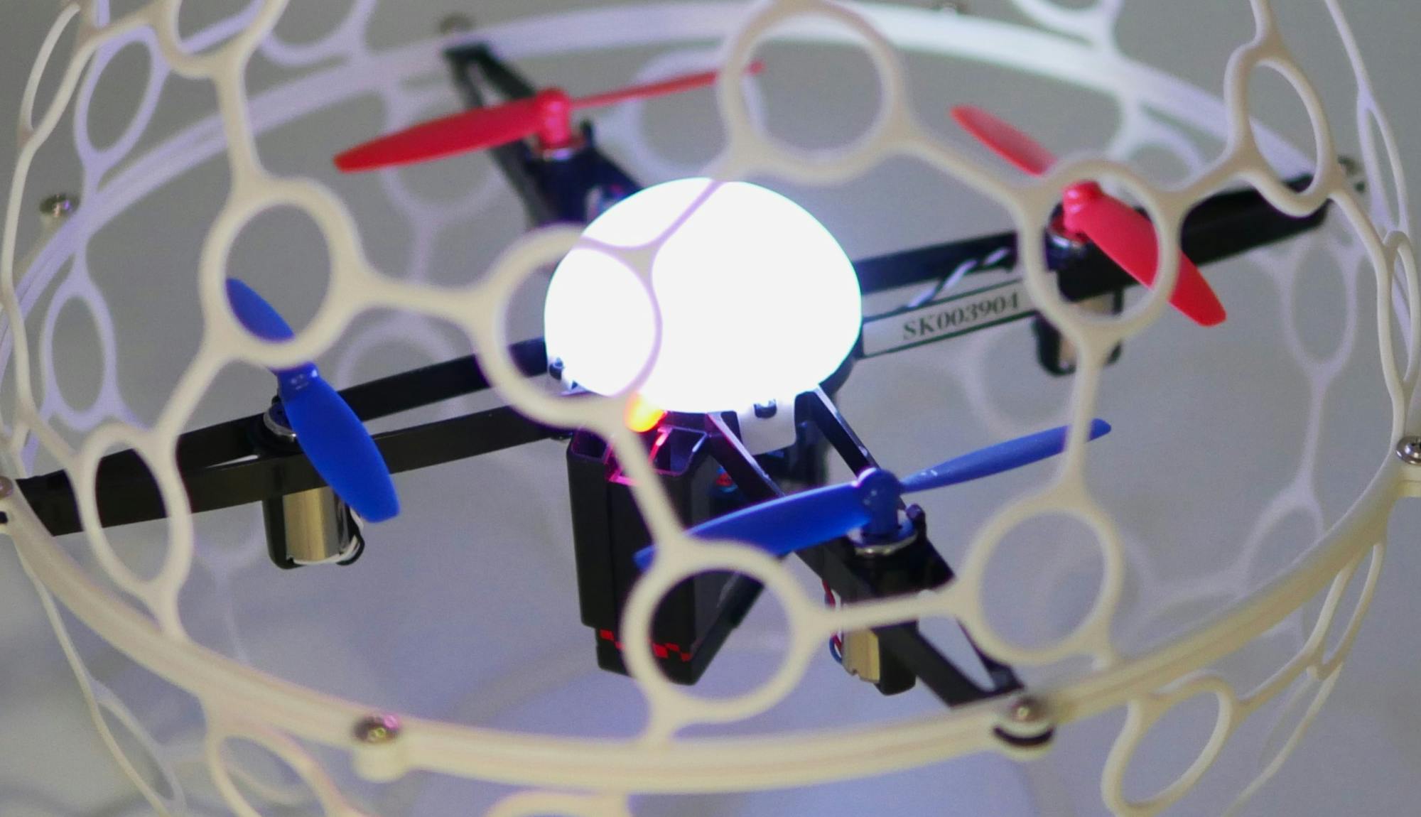 専用のドローンボールは球状のプラスチックフレームで覆われており、接触プレイも安全に行えます。