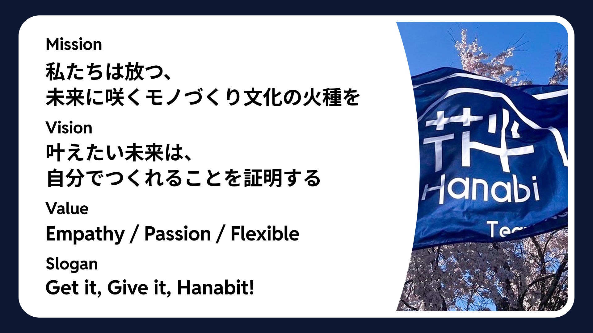 モノづくりは、いつの時代も世界を変えてきています。花火の如く、私たちの創造が一瞬の輝きで終わらず、次世代へ継続する火種となり、一つ一つの火花が大きな灯りとなり未来へと道を照らす光となる。私たちは、そんな文化を未来に咲かせていく。── "Hanabi"という名のもとに。