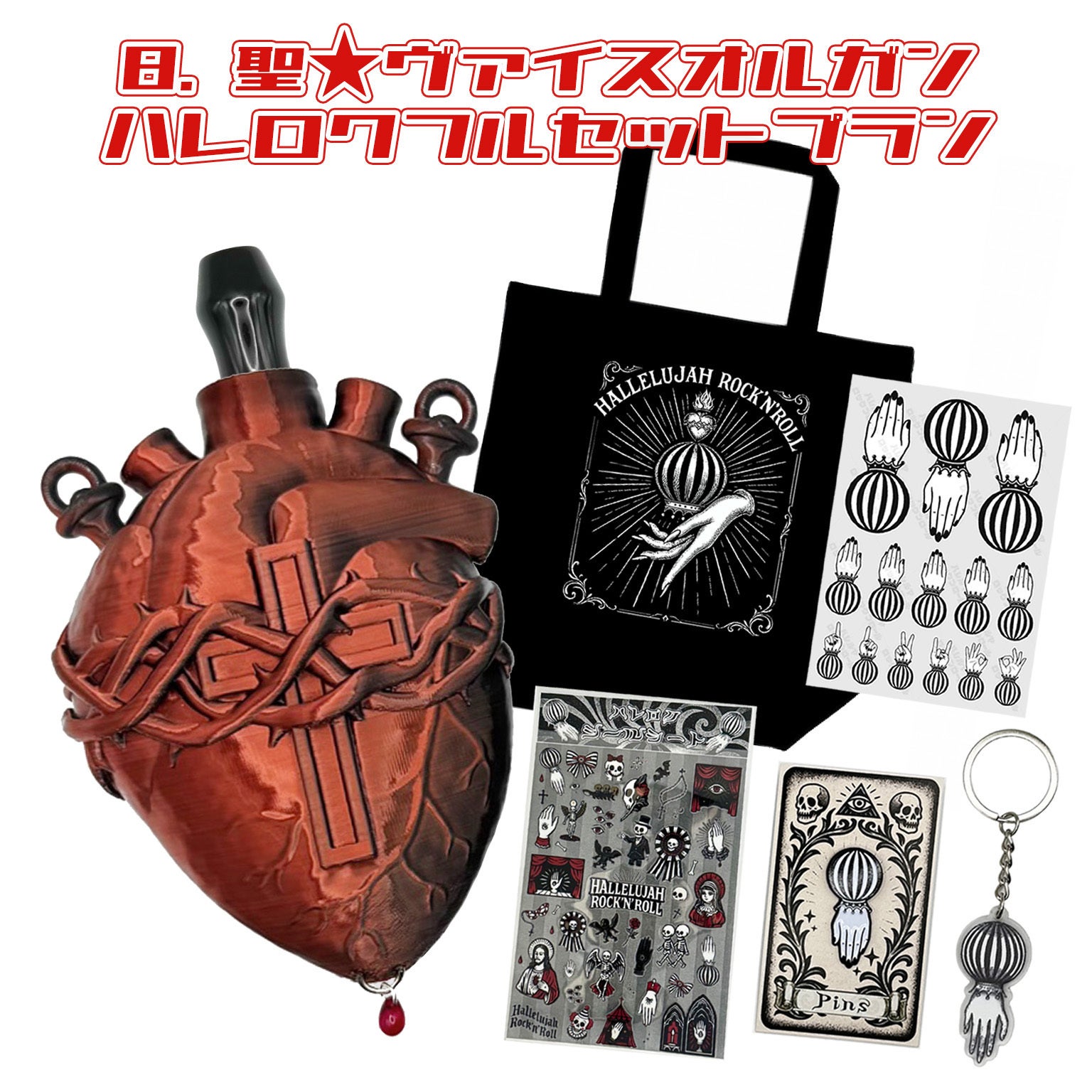 シーシャ用マウスピースホルダー「聖★ヴァイスオルガン」の本体 + 全てのグッズ(お手玉ピンバッジ + お手玉アクリルキーホルダ― + ぷくぷくシールシート + お手玉柄A5クリアステッカー + トートバッグ)