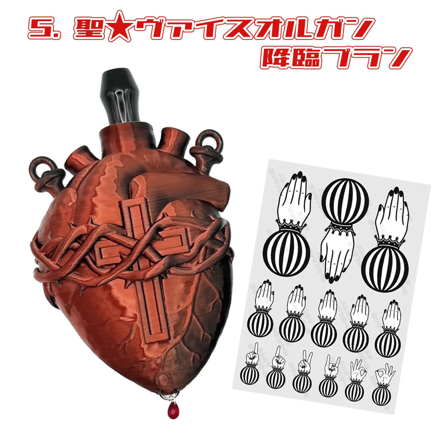 今回のクラファンのリターンのメインであります「聖★ヴァイスオルガン 」もそれにのっとってリアルな心臓のサイズに近い大きさで再現しました。ネックレスの長さも実際の心臓あたりにし厨二病の皆様に刺さる面白いデザインで、SNSなどの投稿でもオシャレな1枚となるのではないかと思っています。