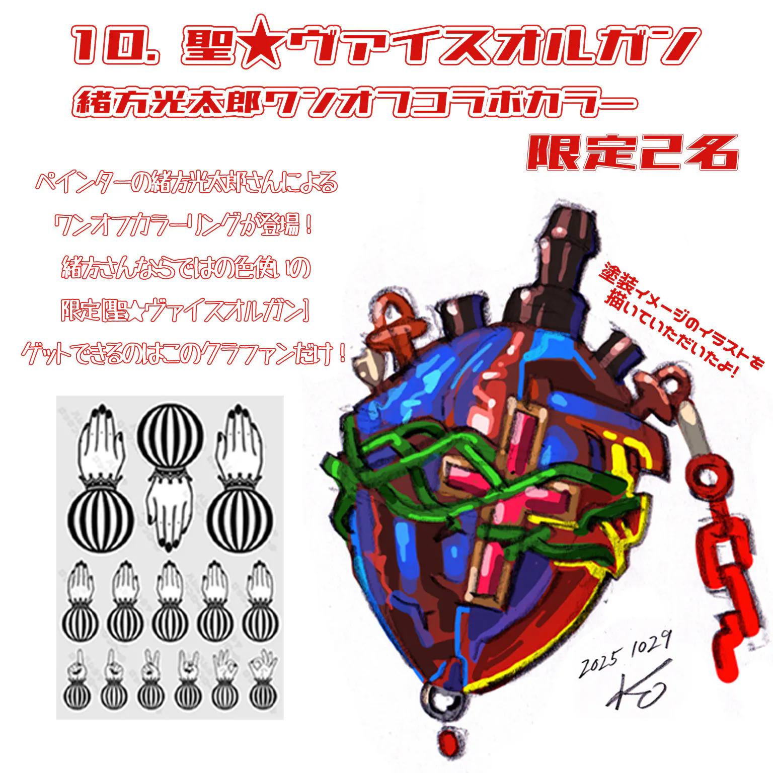 2026/01/13 16:06こんにちは。お待たせいたしました。遂に緒方光太郎さんによるワンオフペイントのリターンが完成しました。立体の「聖★ヴァイスオルガン」が絵画の様に見えますよね!本当に特別な限定品という作品になりました。ご支援いただいた方への発送も近日中に行う予定ですのでもうしばらくお待ちください。 もっと見る