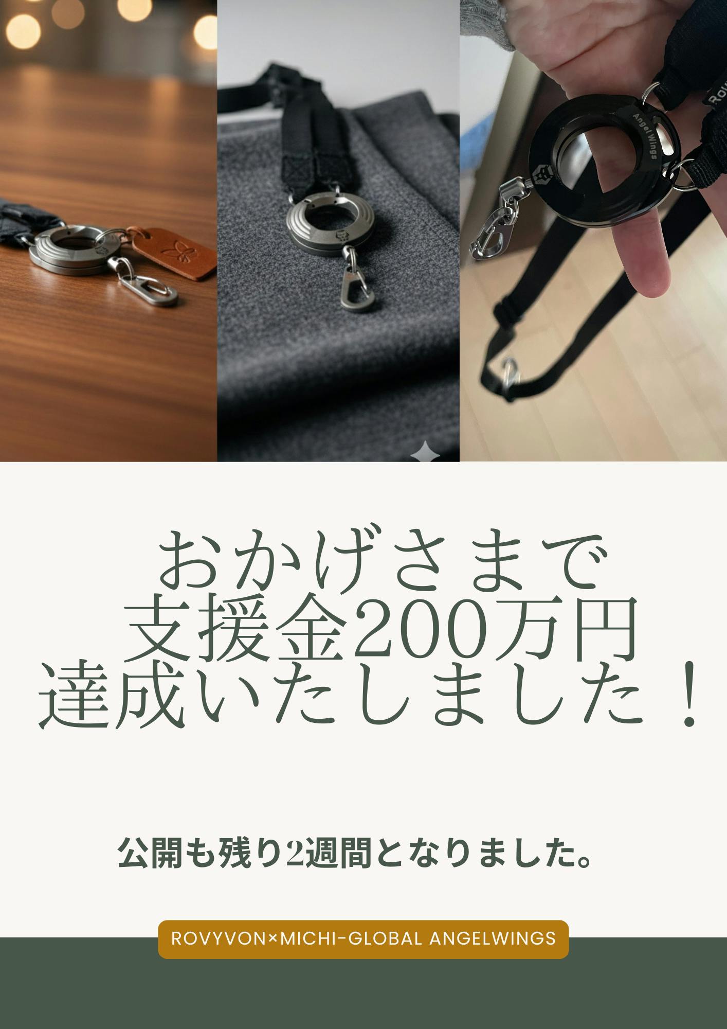 2025/12/24 11:00いつも温かいご支援、そしてプロジェクトを見守っていただき、誠にありがとうございます。皆様から寄せられる期待の声を励みに、ここまで進んでくることができました。早いもので、公開期間も残り「7日間」となりました。本日は、現在ご検討いただいている皆様へ、プロジェクトの現在の状況をありのままにお伝えさせていただきます。■ 「2個セット」の在庫状況について大変ありがたいことに、多くの方にお選びいただいている「2個セット」が残りわずかとなりました。「自分用と、もう一つは家族や友人へ」といったお声も届いており、この製品が誰かの役に立とうとしていることを大変嬉しく感じております。もし複数個でのご支援を検討されている方がいらっしゃいましたら、在庫があるうちにご確認いただければ幸いです。■ 公開期間中の価格についてこのプロジェクトは、Machi-yaでの先行販売として特別な条件でご紹介させていただいております。プロジェクト終了後の一般販売では、どうしても今の価格を維持することが難しく、値上げを予定しております。「この製品の良さを、まずは一人でも多くの方に知っていただきたい」その一心で準備したこの価格でのご案内は、Machi-ya公開中のあと7日間限りとなります。クラウドファンディングを通じて出会えた皆様とのご縁を、私たちは何より大切にしたいと考えています。単なる「モノの売り買い」ではなく、私たちの提案に共感してくださった皆様への感謝を込めて、最後まで走り抜けます。残り1週間となりますが、引き続き温かいご支援と応援を、どうぞよろしくお願いいたします。 もっと見る【ご報告】支援総額200万円を突破しました!