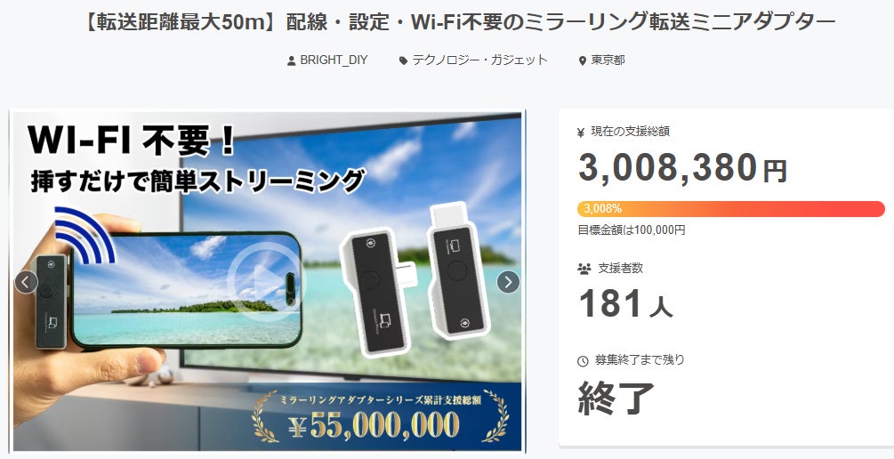 ご支援者様、【転送距離最大50m】配線・設定・Wi-Fi不要のミラーリング転送ミニアダプターにご興味をお持ちいただきありがとうございます。プロジェクト開始から52日目で181人ものご支援者の方々より支援頂き、無事プロジェクト終了を迎えることが出来ました。早速皆様のリターンを2026年03月末にお届けできるよう準備を始めております!皆様にご満足いただけるリターンをお届けできるよう、全力で取り組んで参りますので引き続き、「【転送距離最大50m】配線・設定・Wi-Fi不要のミラーリング転送ミニアダプター」をよろしくお願い致します。BRIGHTチーム
