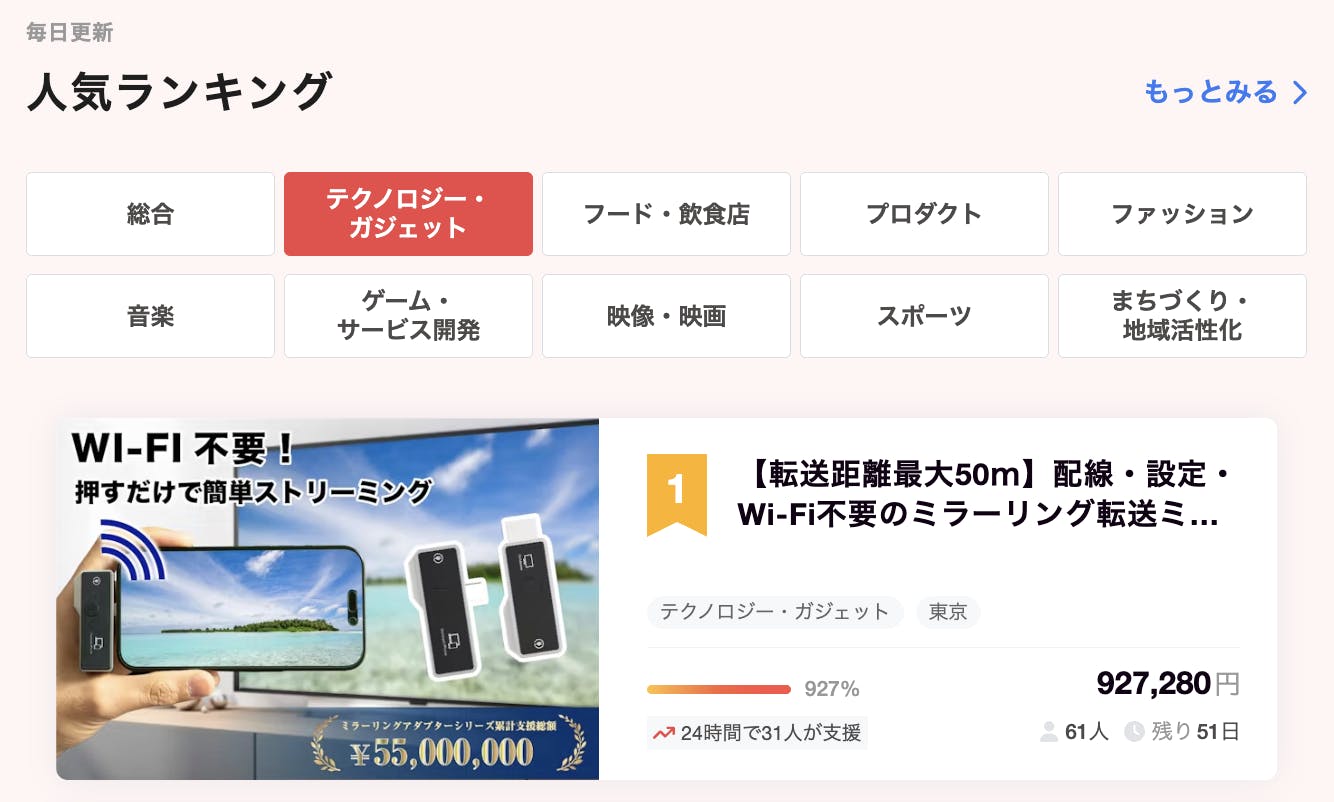 また本日のCampfireランキングテクノロジー· ガジェット部門で 1 位に入賞することが出来ました!