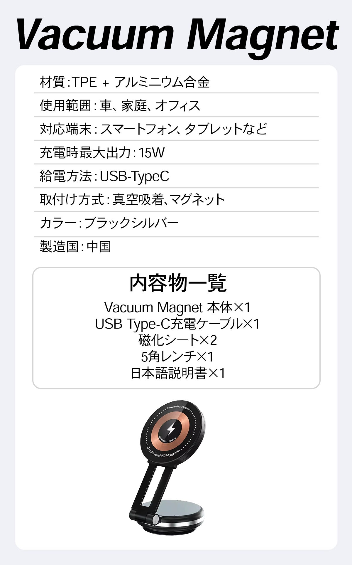 真空吸着で平滑面に強力固定、跡も残さず安心使用!さらにワイヤレス充電対応で、スマホを置くだけで充電可能。コンパクトに折りたためて持ち運びも便利!スマホやタブレットの使い勝手がさらに快適に!