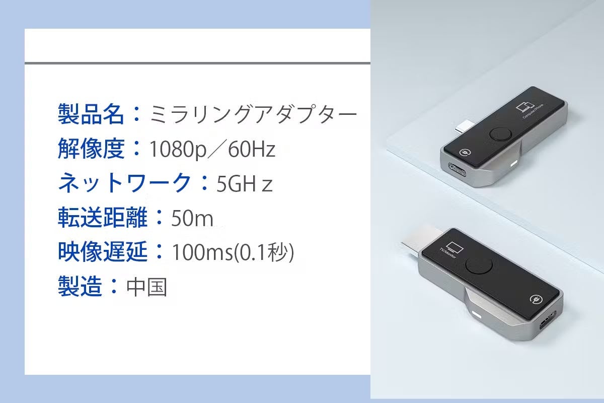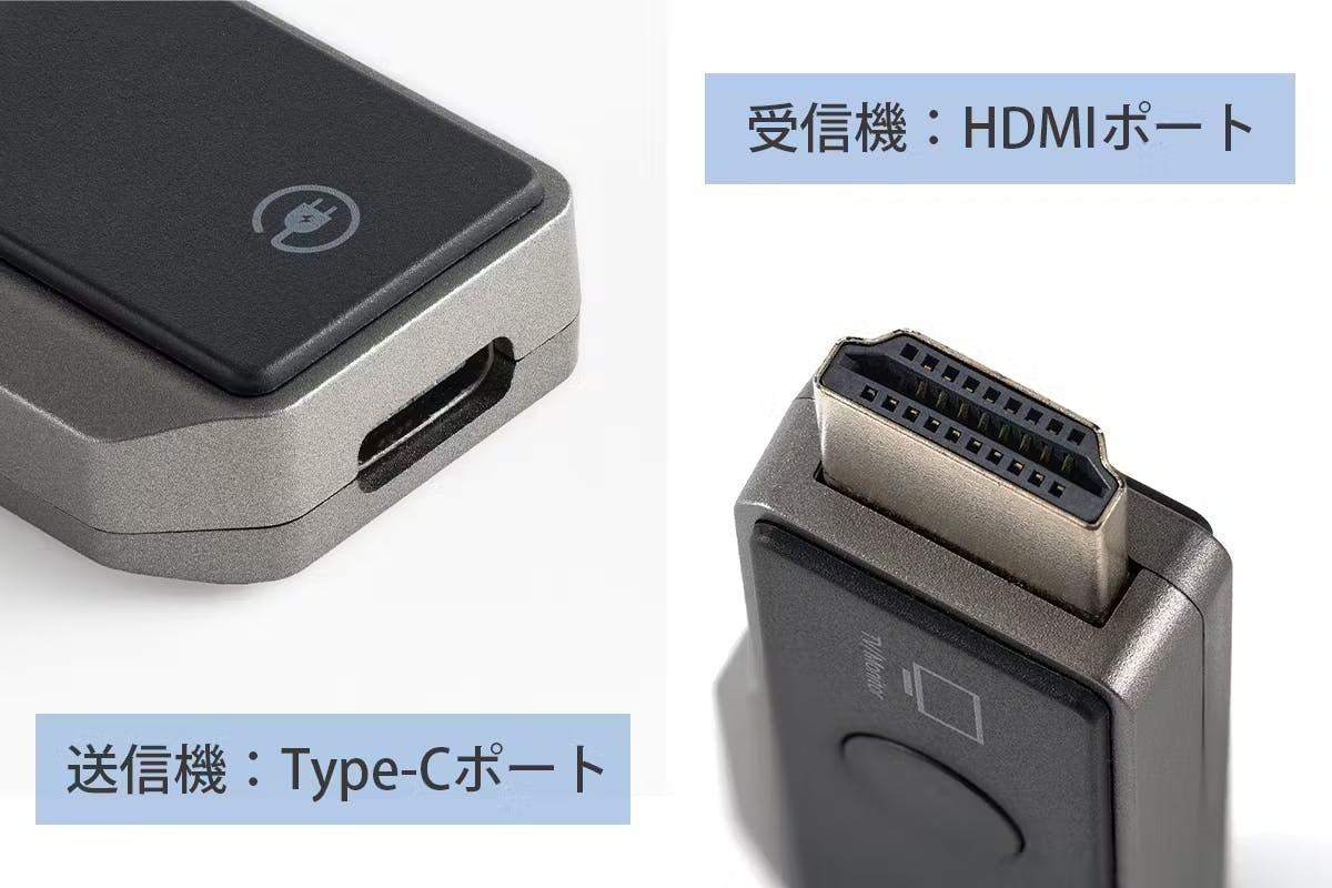 「ミラーリングアダプター」の送信機はType-Cポートを、受信機はHDMIポートを搭載。ビデオ信号と双方向電力伝送に対応しています。