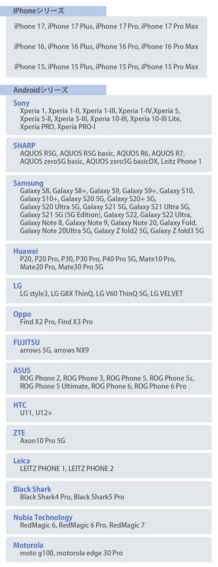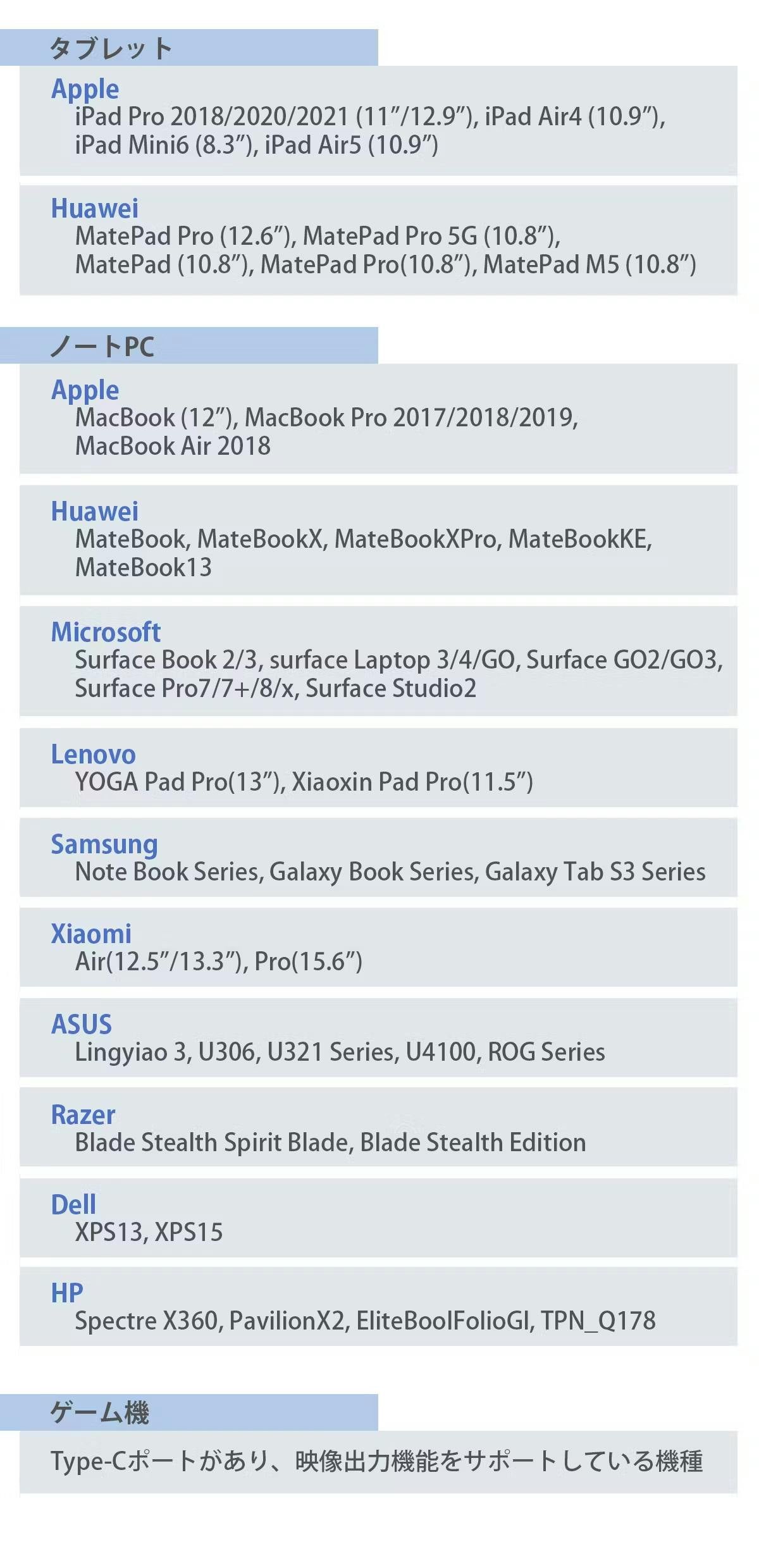 ※リストに記載されている対応機種は一部です。お使いのデバイスがType-Cポートを搭載し、映像出力機能に対応していることが必要です。これにより、デバイスから映像を出力することが可能になります。お使いの機種がリストに載っていない場合は直接購入元に対応の可否を確認してください。