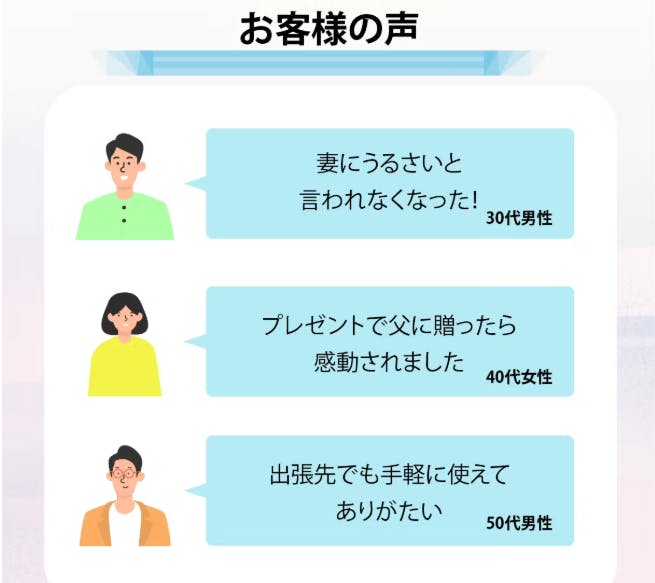 さらに、多くのお客様から喜びの声が届いています。例えば、30代男性は「妻にうるさいと言われなくなった!」と家族関係が良好になった体験を語っています。40代女性は「プレゼントで父に贈ったら感動された」とギフトとしての喜びも。50代男性からは「出張先でも手軽に使えてありがたい」と使い勝手の良さを高く評価されています。