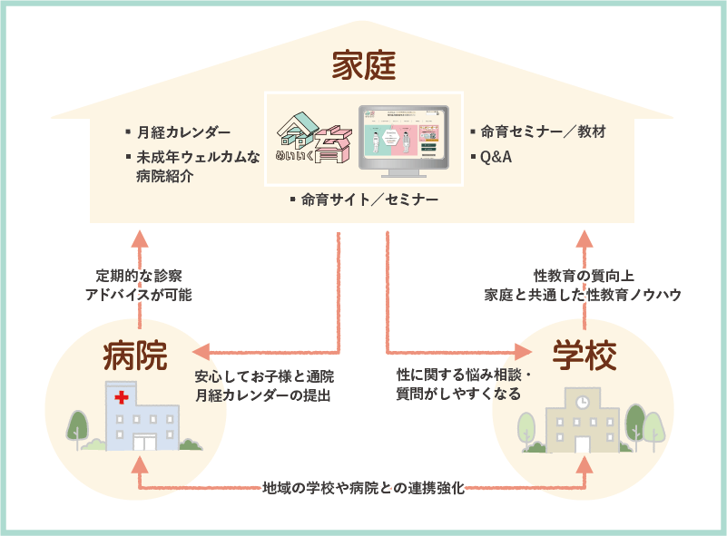 命育サイトやセミナーを通じて、性教育のノウハウを発信するとともに、病院・家庭・学校をつなぐ、共通のツールを提供することで、性にまつわるプラットフォームとなることを目指しています。