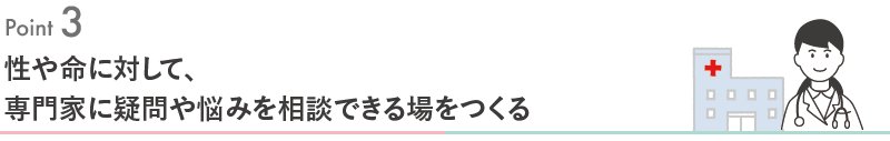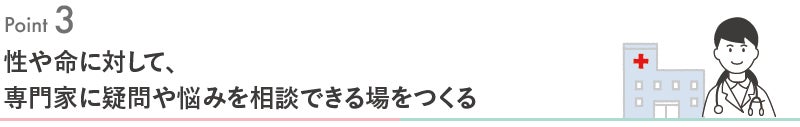 医師や助産師、保健体育教師などの専門家に、性教育や性・命に関して相談できるQ&Aコーナー。また、地域の未成年ウェルカムな婦人科・産婦人科紹介も。