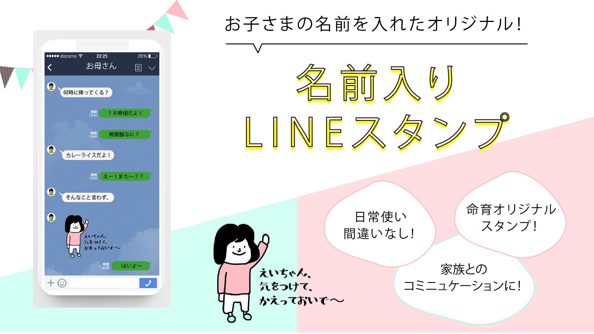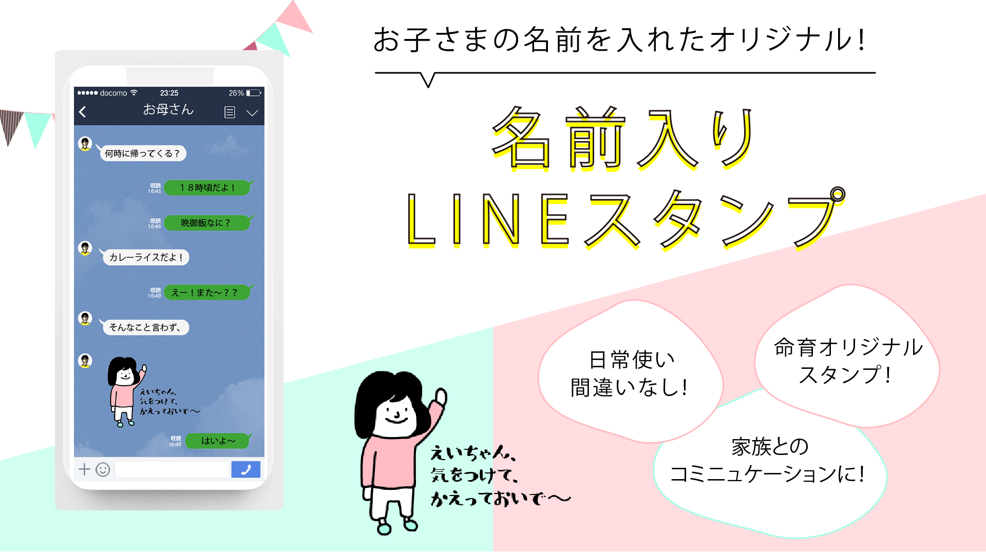 命育LINEスタンプを、あなたのお名前専用にカスタマイズいたします。デザインは未定ですが、親子や家族間で使っていただけるような業務連絡スタンプを予定しています。お好きなお名前で可能ですので、お子様やお友達にプレゼントも◎(LINE IDを後ほどお伺いし、命育LINEよりスタンプをプレゼントいたします)