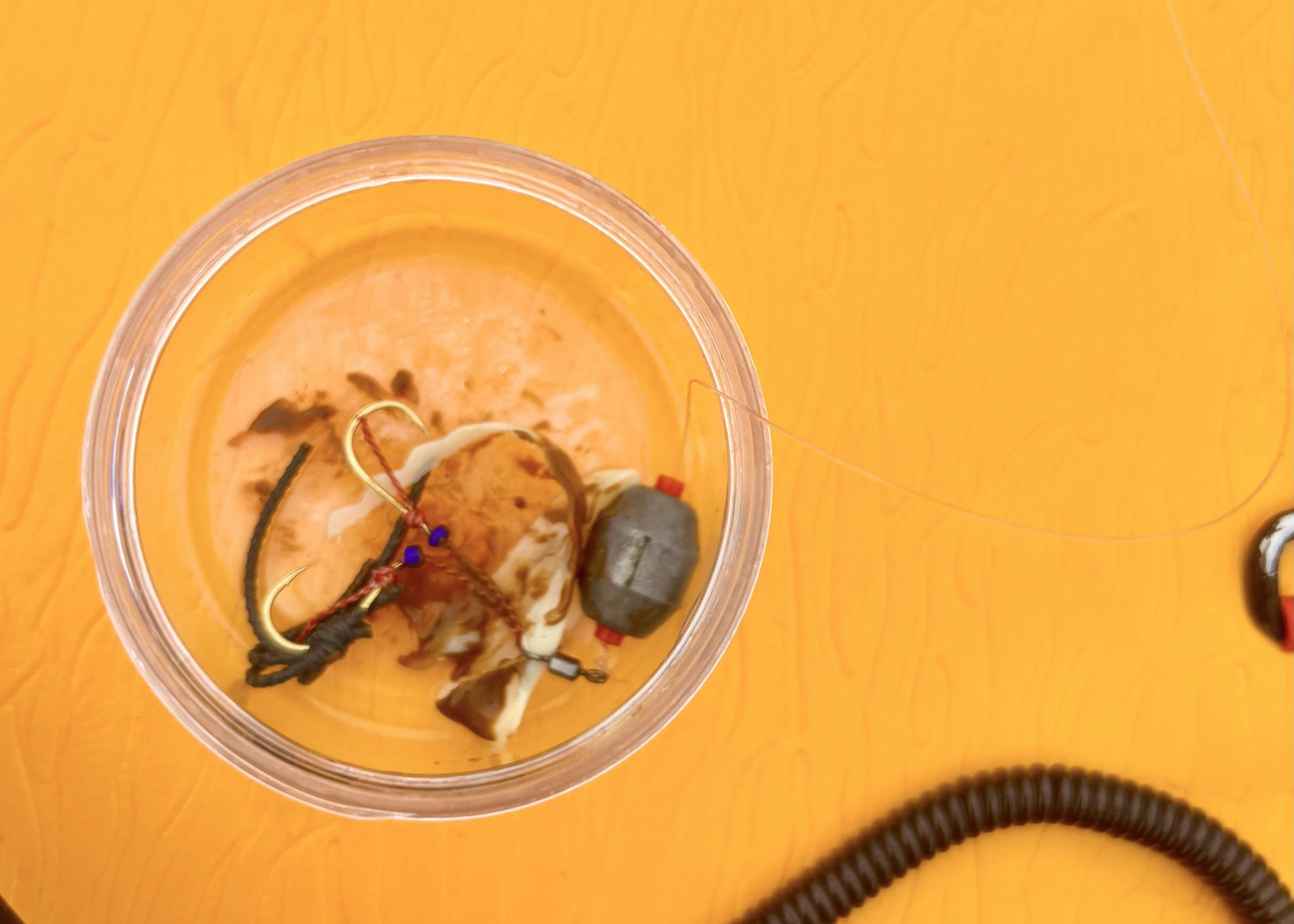 SUPフィッシングにて、SUPが汚れないように容器に入れて塗ってます。