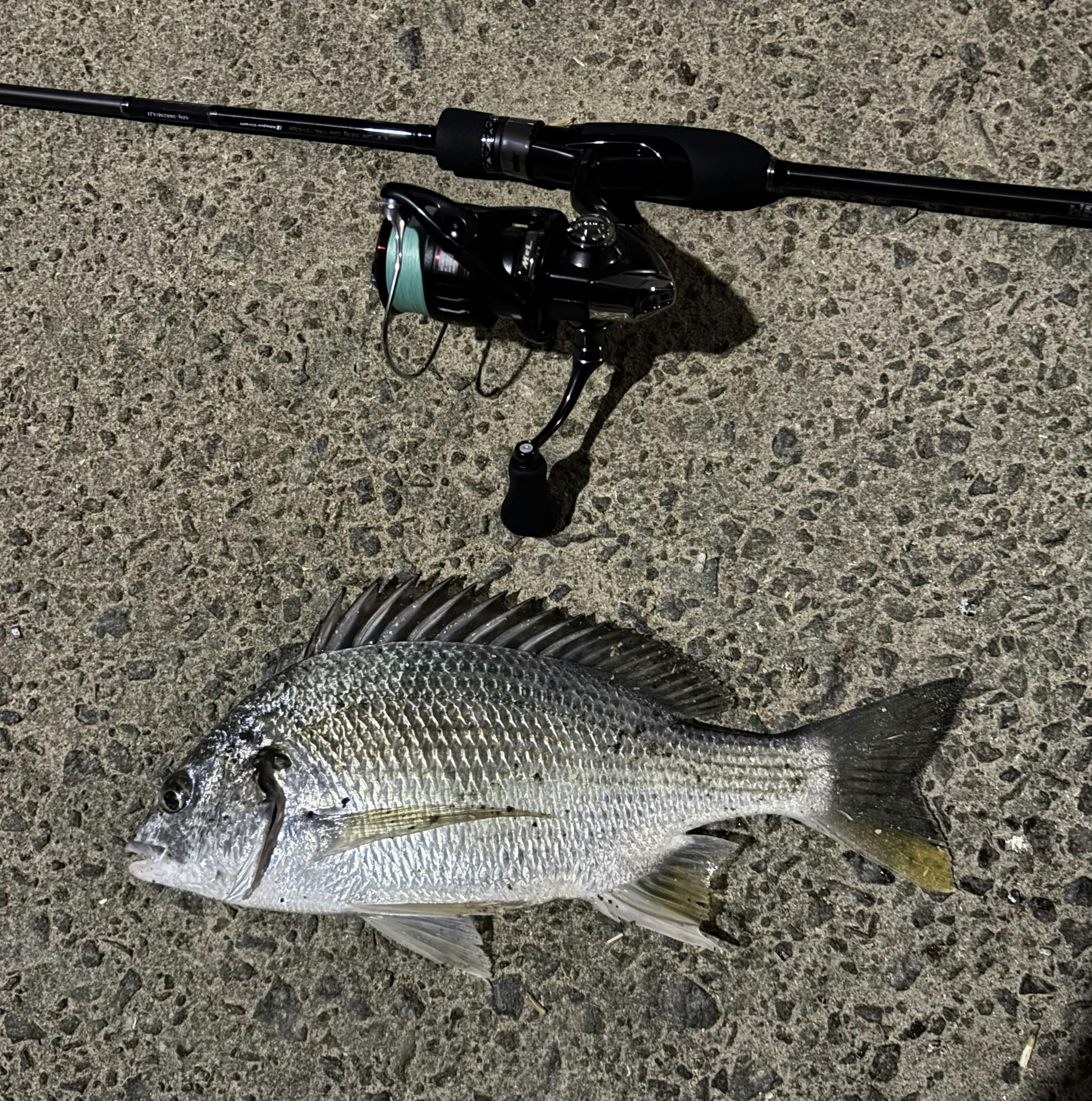 ONE'SBOOSTERを塗ってキャスト、リグを底まで沈めてからネチネチと探ってるとコンとあたり。30アップのキビレが釣れました。